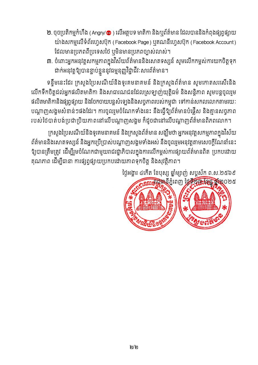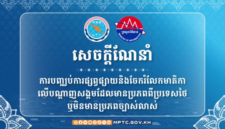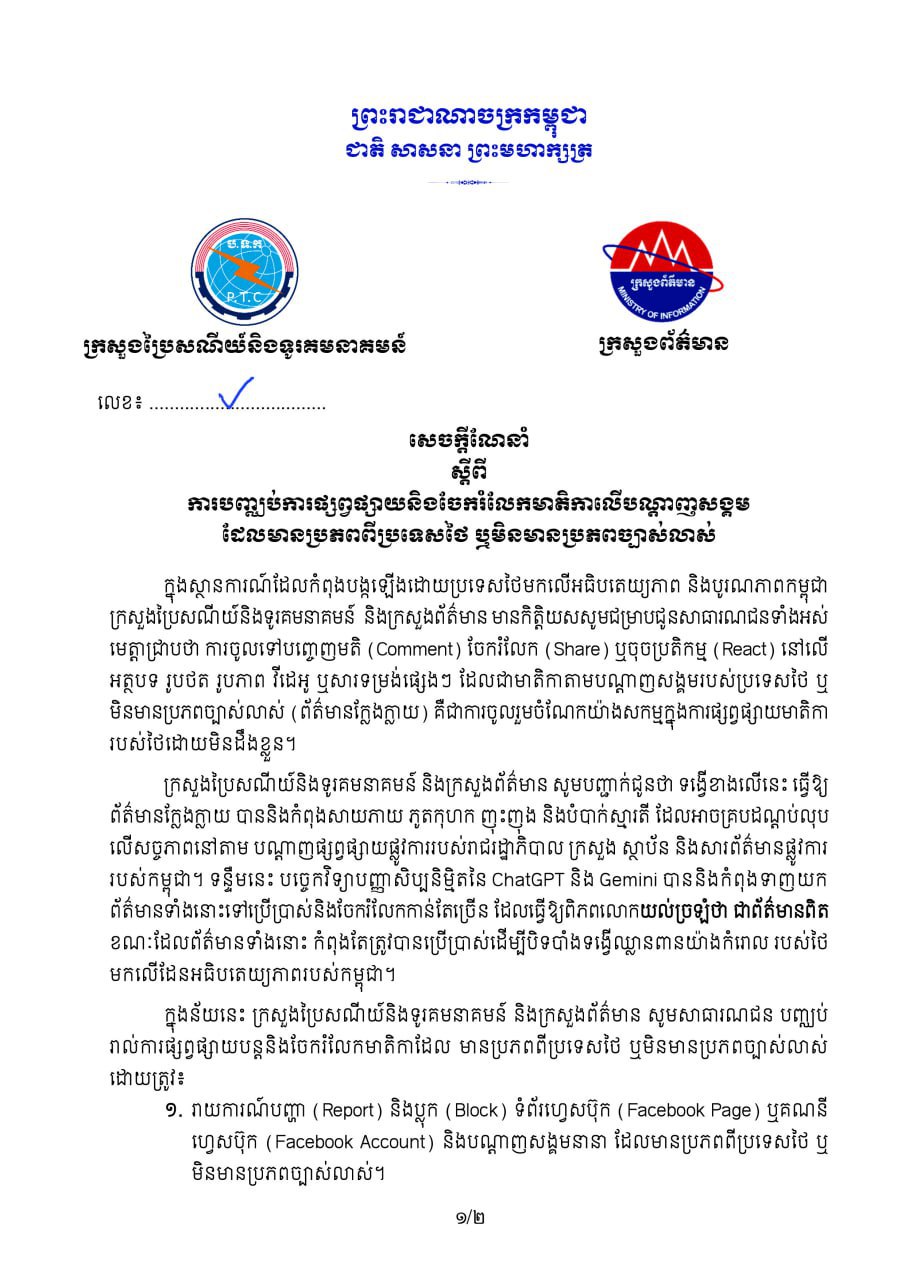 ក្រសួងព័ត៌មាន និងក្រសួងប្រៃសណីយ៍ ណែនាំឱ្យបញ្ឈប់ការផ្សព្វផ្សាយ និងចែករំលែកមាតិកាលើបណ្ដាញសង្គម ដែលមានប្រភពពីប្រទេសថៃ ឬមិនមានប្រភពច្បាស់លាស់