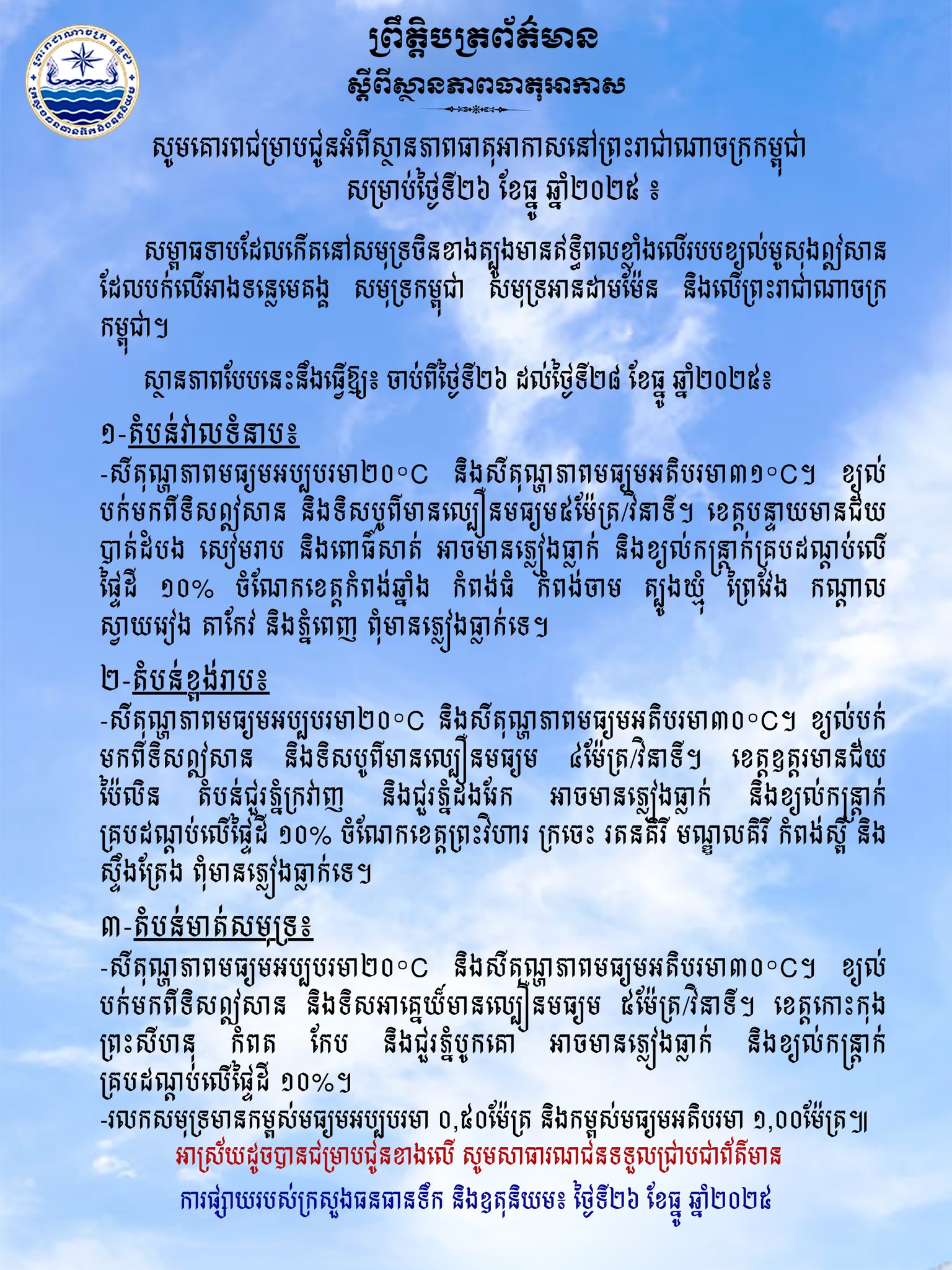 ក្រសួងធនធានទឹក ជូនដំណឹងអំពីស្ថានភាពធាតុអាកាសនៅកម្ពុជា សម្រាប់ថ្ងៃទី២៦ ខែធ្នូ ឆ្នាំ២០២៥