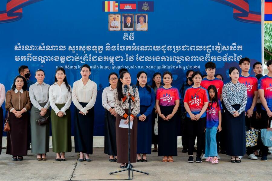 លោកជំទាវបណ្ឌិត បានពាំនាំប្រសាសន៍ផ្តាំផ្ញើសួរសុខទុក្ខដ៏ខ្ពង់ខ្ពស់បំផុត និងដោយក្តីបារម្ភបំផុតរបស់សម្តេចអគ្គមហាសេនាបតីតេជោ ហ៊ុន សែន និងសម្តេចកិតិ្តព្រឹទ្ធបណ្ឌិត ប៊ុន រ៉ានី ហ៊ុនសែន ព្រមទាំងសម្តេចមហាបវរធិបតី ហ៊ុន ម៉ាណែត ជូនប្រជាពលរដ្ឋភៀសសឹកគ្រប់រូប និងថែមទាំងបាននាំយកអំណោយដ៏ថ្លៃថ្លាបំផុតរបស់ សម្តេចមហាបវរធិបតី ហ៊ុន ម៉ាណែត និងលោកជំទាវបណ្ឌិតផ្ទាល់ ប្រគល់ជូនជនភៀសសឹកគ្រប់ៗរូប ដើម្បីប្រើប្រាស់ និងសម្រួលជីវភាពរស់នៅប្រចាំថ្ងៃ ។