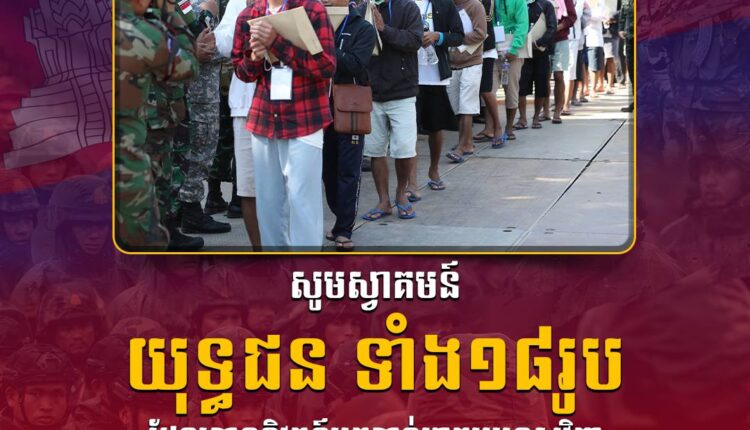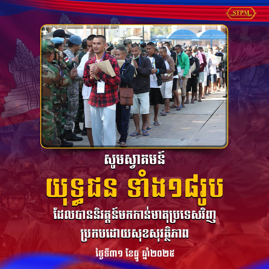 សូមជម្រាបថា នៅព្រឹកថ្ងៃទី៣១ ខែធ្នូ ឆ្នាំ២០២៥នេះ យុទ្ធជនកម្ពុជា ចំនួន១៨រូប ត្រូវបានភាគីថៃបានដោះលែងប្រគល់ឲ្យមកកម្ពុជាវិញហើយតាមច្រកខេត្តប៉ៃលិន បន្ទាប់ពីចាប់អស់រយៈពេល១៥៥ថ្ងៃមក។