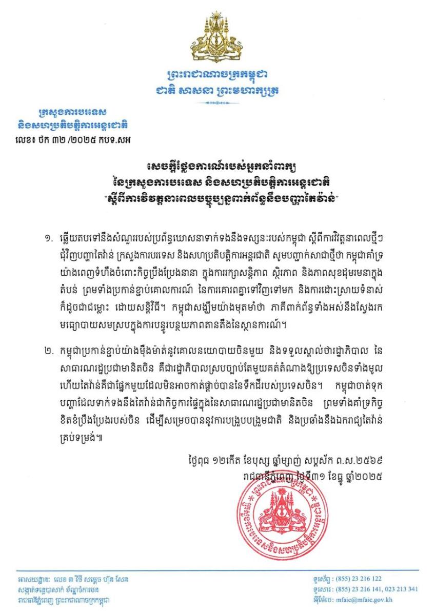 ១. ឆ្លើយតបទៅនឹងសំណួររបស់ប្រព័ន្ធឃោសនាទាក់ទងនឹងទស្សនៈរបស់កម្ពុជា ស្តីពី ការវិវត្តនាពេលថ្មីៗ ជុំវិញបញ្ហាតៃវ៉ាន់ ក្រសួងការបរទេស និងសហប្រតិបត្តិការអន្តរជាតិ សូមបញ្ជាក់សាជាថ្មីថា កម្ពុជាគាំទ្រ យ៉ាងពេញទំហឹងចំពោះកិច្ចប្រឹងប្រែងនានា ក្នុងការរក្សាសន្តិភាព ស្ថិរភាព និងភាពសុខដុមរមនាក្នុង តំបន់ ព្រមទាំងប្រកាន់ខ្ជាប់គោលការណ៍ នៃការគោរពគ្នាទៅវិញទៅមក និងការដោះស្រាយទំនាស់ ក៏ដូចជាជម្លោះ ដោយសន្តិវិធី។ កម្ពុជាសង្ឃឹមយ៉ាងមុតមាំថា ភាគីពាក់ព័ន្ធទាំងអស់នឹងស្វែងរកមធ្យោបាយសមស្របក្នុងការបន្ធូរបន្ថយភាពតានតឹងនៃស្ថានការណ៍។