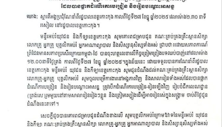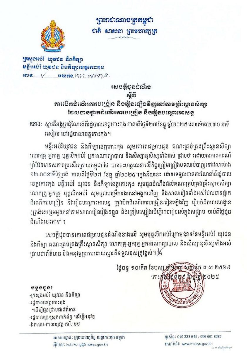 ខាងក្រោមនេះជាសេចក្តីជូនដំណឹងមន្ទីរអប់រំ យុវជន និងកីឡារខេត្តកោះកុង៖