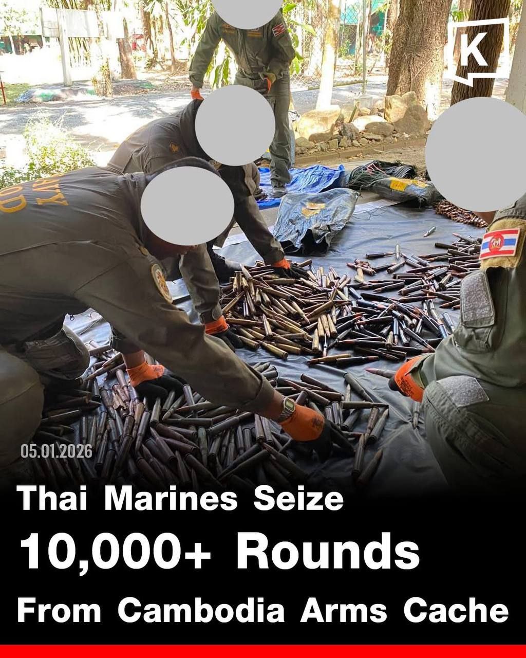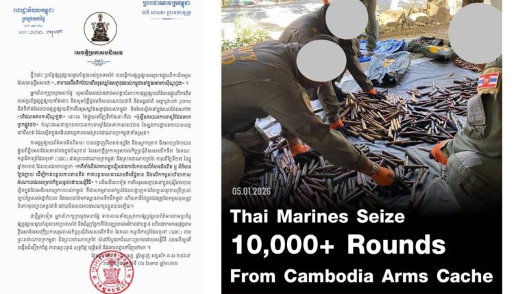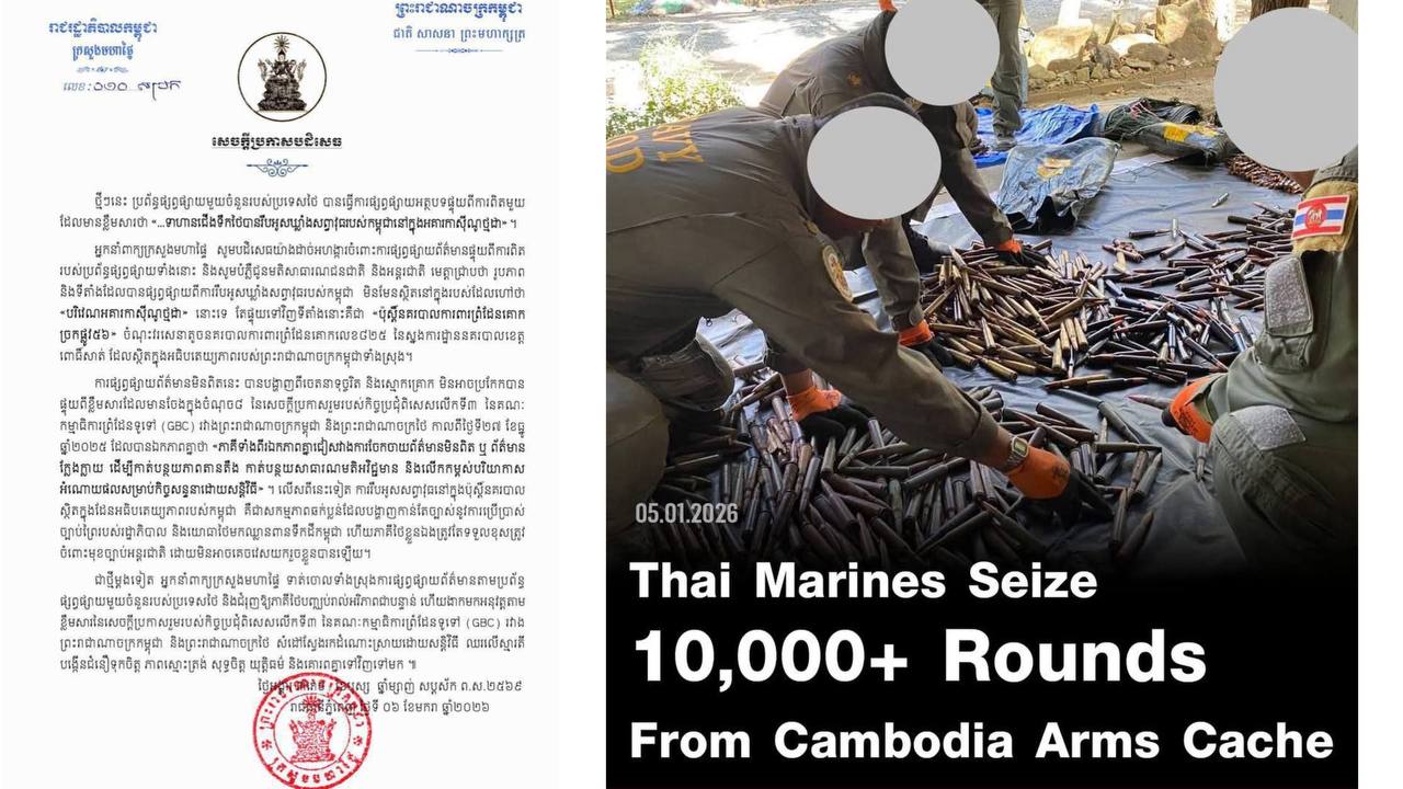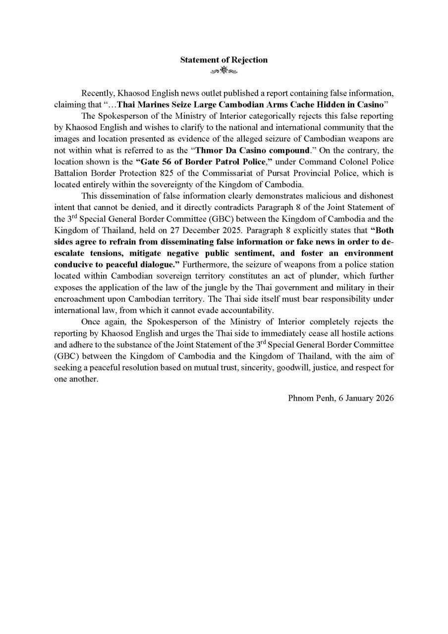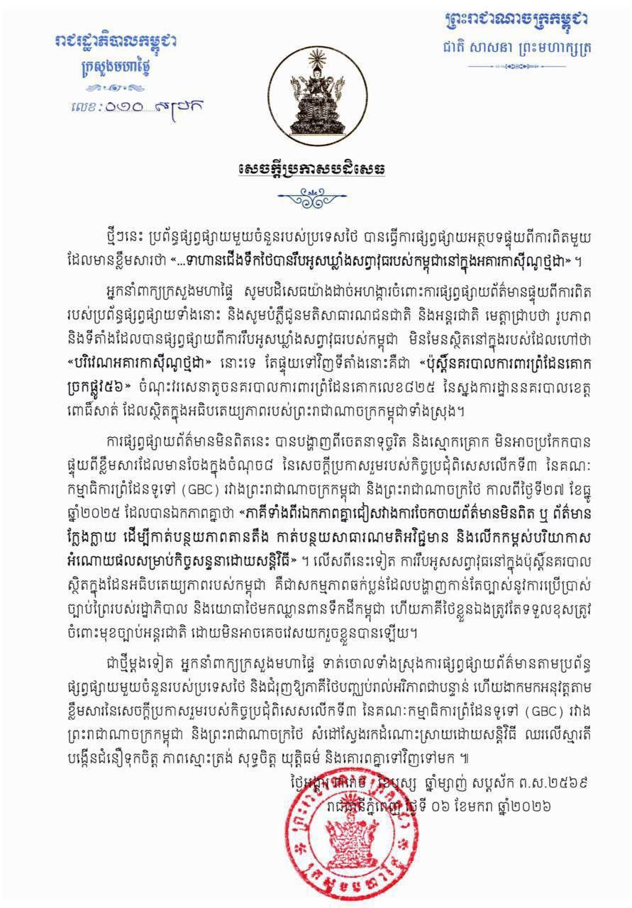 (ភ្នំពេញ)៖ អ្នកនាំពាក្យក្រសួងមហាផ្ទៃ នៅថ្ងៃទី៦ ខែមករា ឆ្នាំ២០២៦នេះ បានចេញសេចក្ដីប្រកាសបដិសេធ ការផ្សាយរបស់កាសែត Khaosod English ថា «ទាហានជើងទឹកថៃរឹបអូសឃ្លាំងសព្វាវុធកម្ពុជា ក្នុងអគារកាស៊ីណូថ្មដា» ខណៈការពិត គឺជា «ប៉ុស្តិ៍នគរបាលការពារព្រំដែនគោក» ក្នុងដែនអធិបតេយ្យកម្ពុជា។