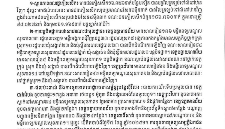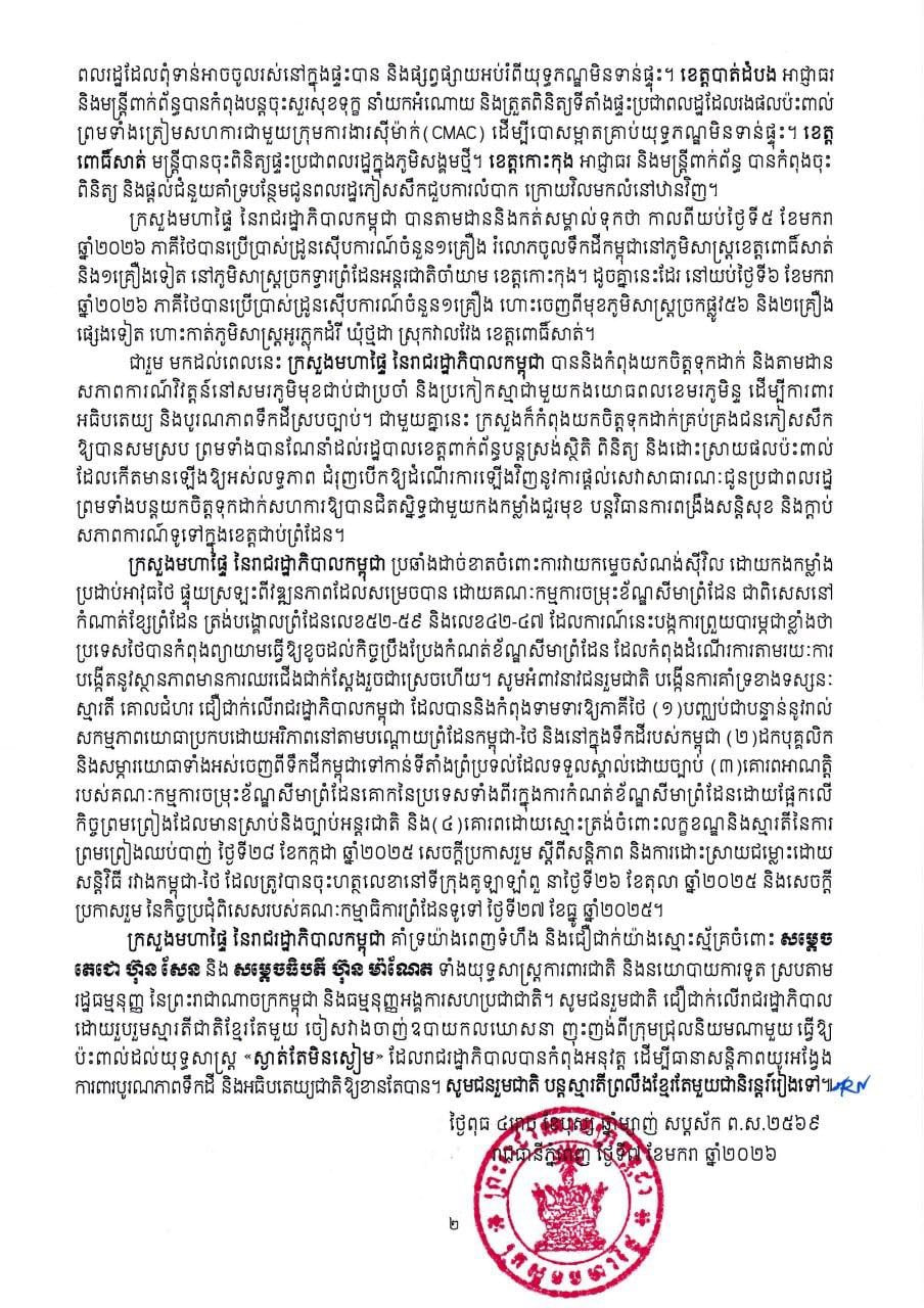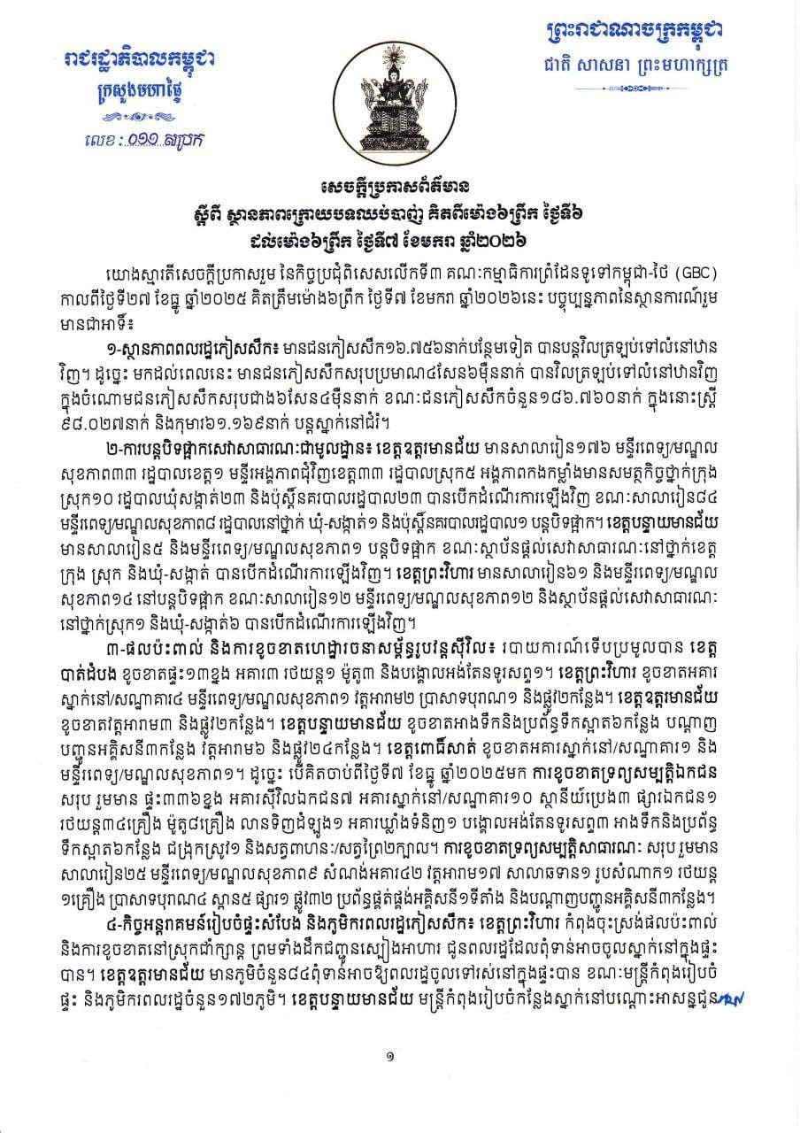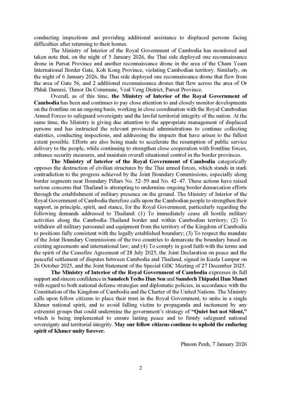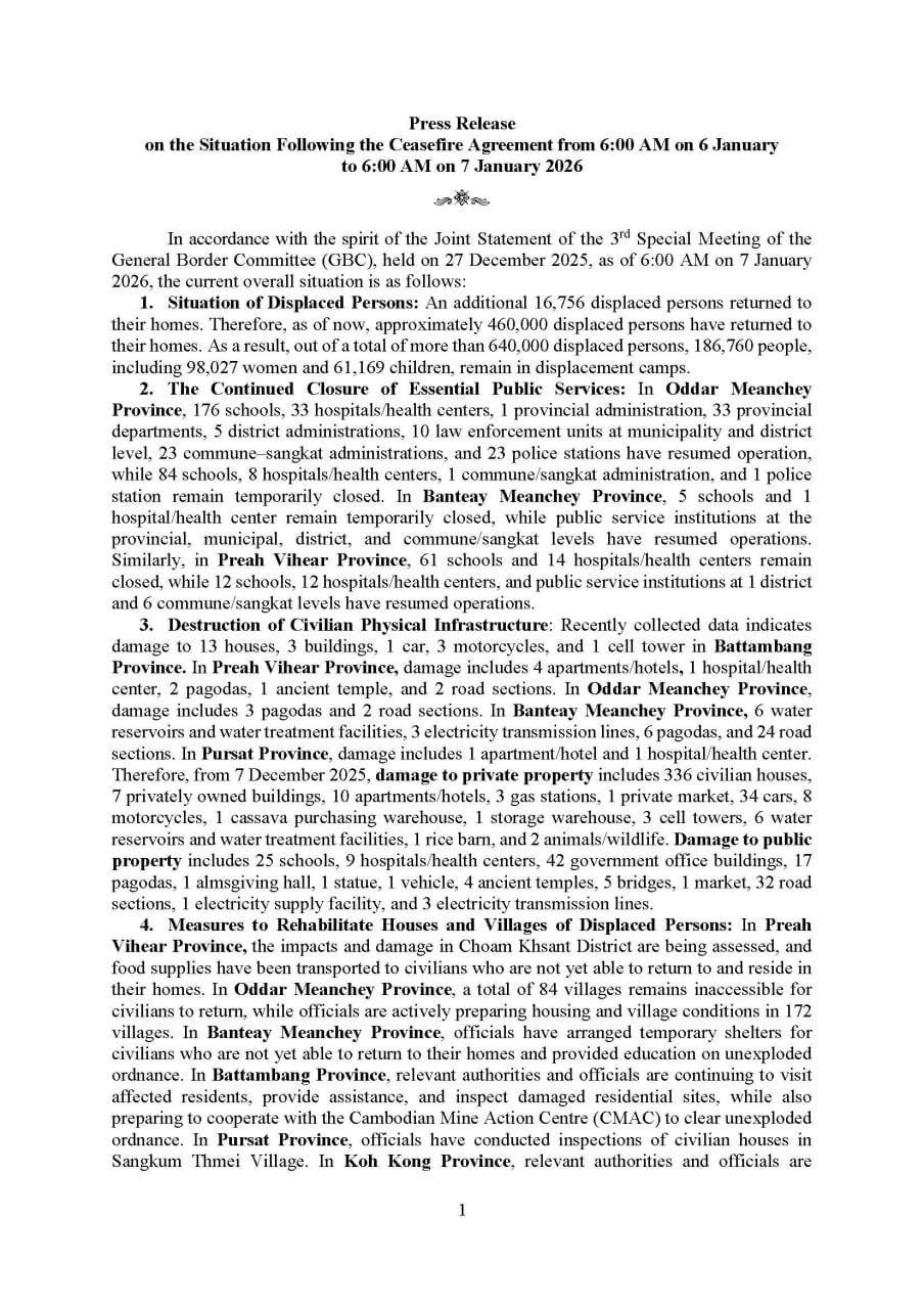 (ភ្នំពេញ)៖ សេចក្តីប្រកាសរបស់ក្រសួងមហាផ្ទៃ បានឲ្យដឹងថា គិតត្រឹមម៉ោង៦ព្រឹក ថ្ងៃទី០៧ ខែមករា ឆ្នាំ២០២៦នេះ មានជនភៀសសឹក១៦.៧៥៦នាក់បន្ថែមទៀត បានបន្តវិលត្រឡប់ទៅលំនៅឋានវិញ ដែលមកដល់ពេលនេះ មានជនភៀសសឹកសរុបប្រមាណ៤សែន៦ម៉ឺននាក់ហើយ បានវិលត្រឡប់ទៅលំនៅឋានវិញ ក្នុងចំណោមជនភៀសសឹកសរុបជាង៦សែន៤ម៉ឺននាក់ ហើយបច្ចុប្បន្នមានជនភៀសសឹក ១៨៦.៧៦០នាក់ កំពុងបន្តស្នាក់នៅជំរំ។