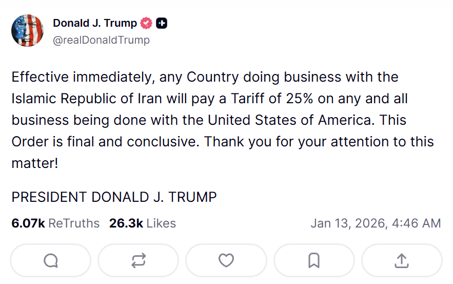 នៅថ្ងៃចន្ទទី១២ខែមករាឆ្នាំ២០២៦ (ពេលវេលានៅអាមេរិក) ប្រមុខរដ្ឋាភិបាលទីក្រុងវ៉ាស៊ីនតោនលោក ដូណាល់ ត្រាំ បានប្រកាសយកពន្ធ២៥% លើទំនិញនាំចូលរបស់ប្រទេសទាំងឡាយណាដែលរកស៊ីជាមួយអ៊ីរ៉ង់។