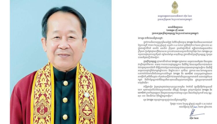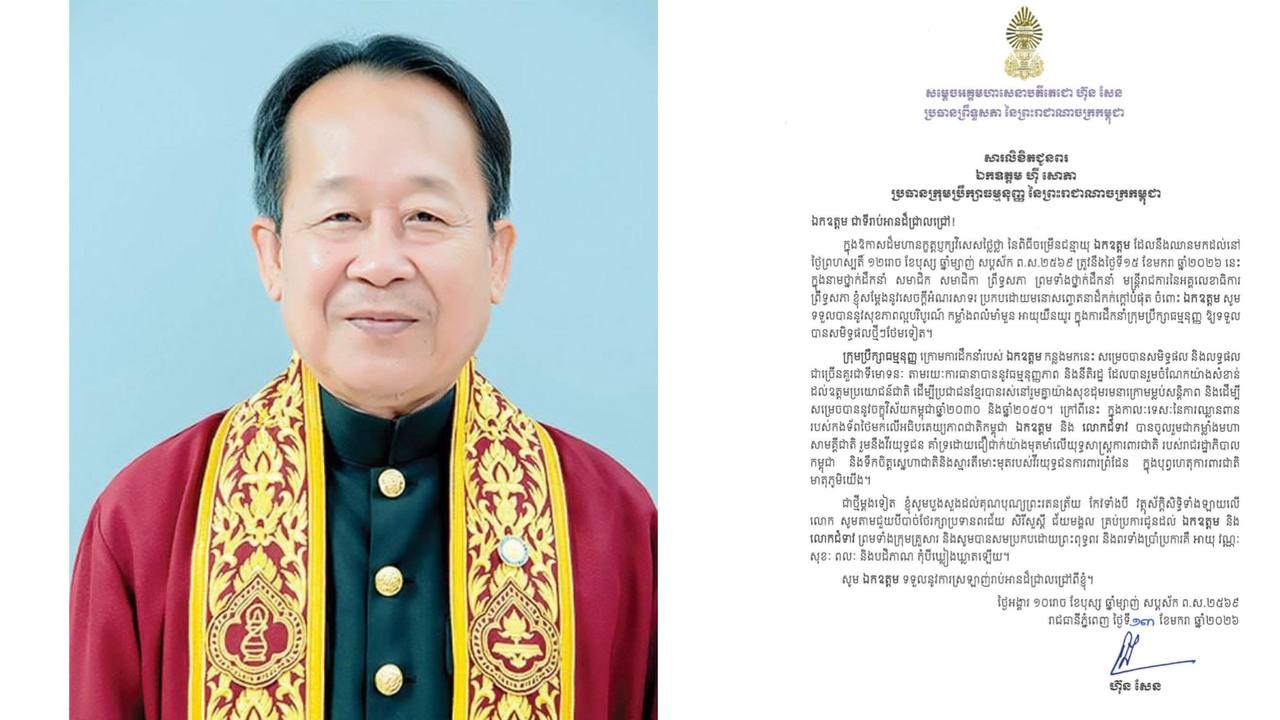 (ភ្នំពេញ)៖ សម្តេចអគ្គមហាសេនាបតីតេជោ ហ៊ុន សែន ប្រធានព្រឹទ្ធសភា នៃព្រះរាជាណាចក្រកម្ពុជា បានចេញសារលិខិតជូនពរ លោក ហ៉ី សោភា ប្រធានក្រុមប្រឹក្សាធម្មនុញ្ញ នៃព្រះរាជាណាចក្រកម្ពុជា ក្នុងឱកាសដ៏មហានក្ខត្តឫក្សវិសេសថ្លៃថ្លា នៃពិធីចម្រើនជន្មាយុ ដែលនឹងឈានមកដល់នៅថ្ងៃព្រហស្បតិ៍ ១២រោច ខែបុស្ស ឆ្នាំម្សាញ់ សប្តស័ក ព.ស.២៥៦៩ ត្រូវនឹងថ្ងៃទី១៥ ខែមករា ឆ្នាំ២០២៦។