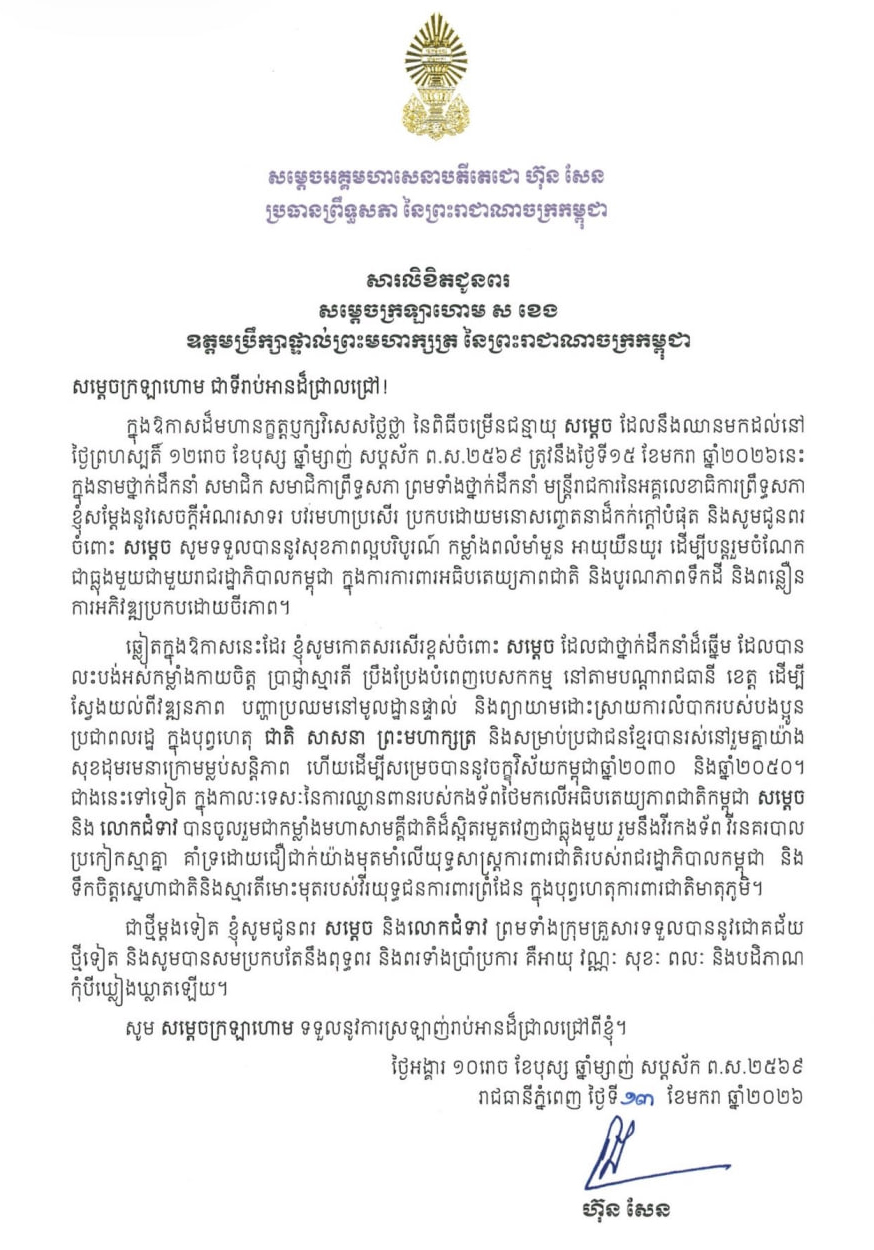 ក្នុងសារលិខិតជូនពរ របស់សម្ដេចតេជោ ហ៊ុន សែន បានសរសេរថា «ក្នុងឱកាសដ៏មហានក្ខត្តឫក្សវិសេសថ្លៃថ្លា នៃពិធីចម្រើនជន្មាយុសម្តេច ដែលនឹងឈានមកដល់នៅ ថ្ងៃព្រហស្បតិ៍ ១២រោច ខែបុស្ស ឆ្នាំម្សាញ់ សប្តស័ក ព.ស.២៥៦៩ ត្រូវនឹងថ្ងៃទី១៥ ខែមករា ឆ្នាំ២០២៦នេះ ក្នុងនាមថ្នាក់ដឹកនាំ សមាជិក សមាជិកាព្រឹទ្ធសភា ព្រមទាំងថ្នាក់ដឹកនាំ មន្ត្រីរាជការនៃអគ្គលេខាធិការព្រឹទ្ធសភា ខ្ញុំសម្តែងនូវសេចក្តីអំណរសាទរ បវរមហាប្រសើរ ប្រកបដោយមនោសញ្ចេតនាដ៏កក់ក្តៅបំផុត និងសូមជូនពរ ចំពោះ សម្តេច សូមទទួលបាននូវសុខភាពល្អបរិបូរណ៍ កម្លាំងពលំមាំមួន អាយុយឺនយូរ ដើម្បីបន្តរួមចំណែក ជាធ្លុងមួយជាមួយរាជរដ្ឋាភិបាលកម្ពុជា ក្នុងការការពារអធិបតេយ្យភាពជាតិ និងបូរណភាពទឹកដី និងពន្លឿន ការអភិវឌ្ឍប្រកបដោយចីរភាព។