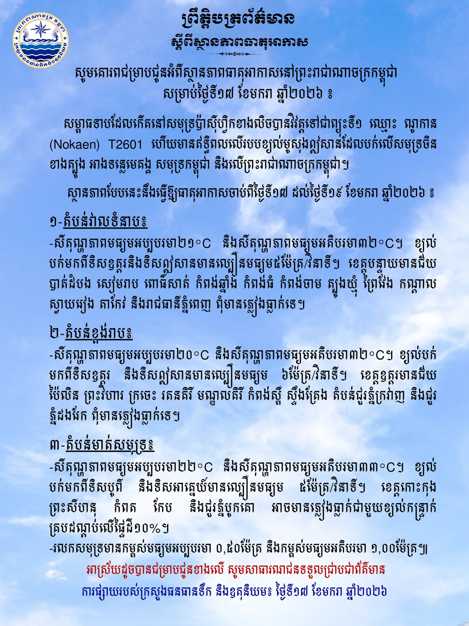 ក្រសួងធនធានទឹក ជូនដំណឹងអំពីស្ថានភាពធាតុអាកាសនៅកម្ពុជា សម្រាប់ថ្ងៃទី១៧ ខែមករា ឆ្នាំ២០២៦