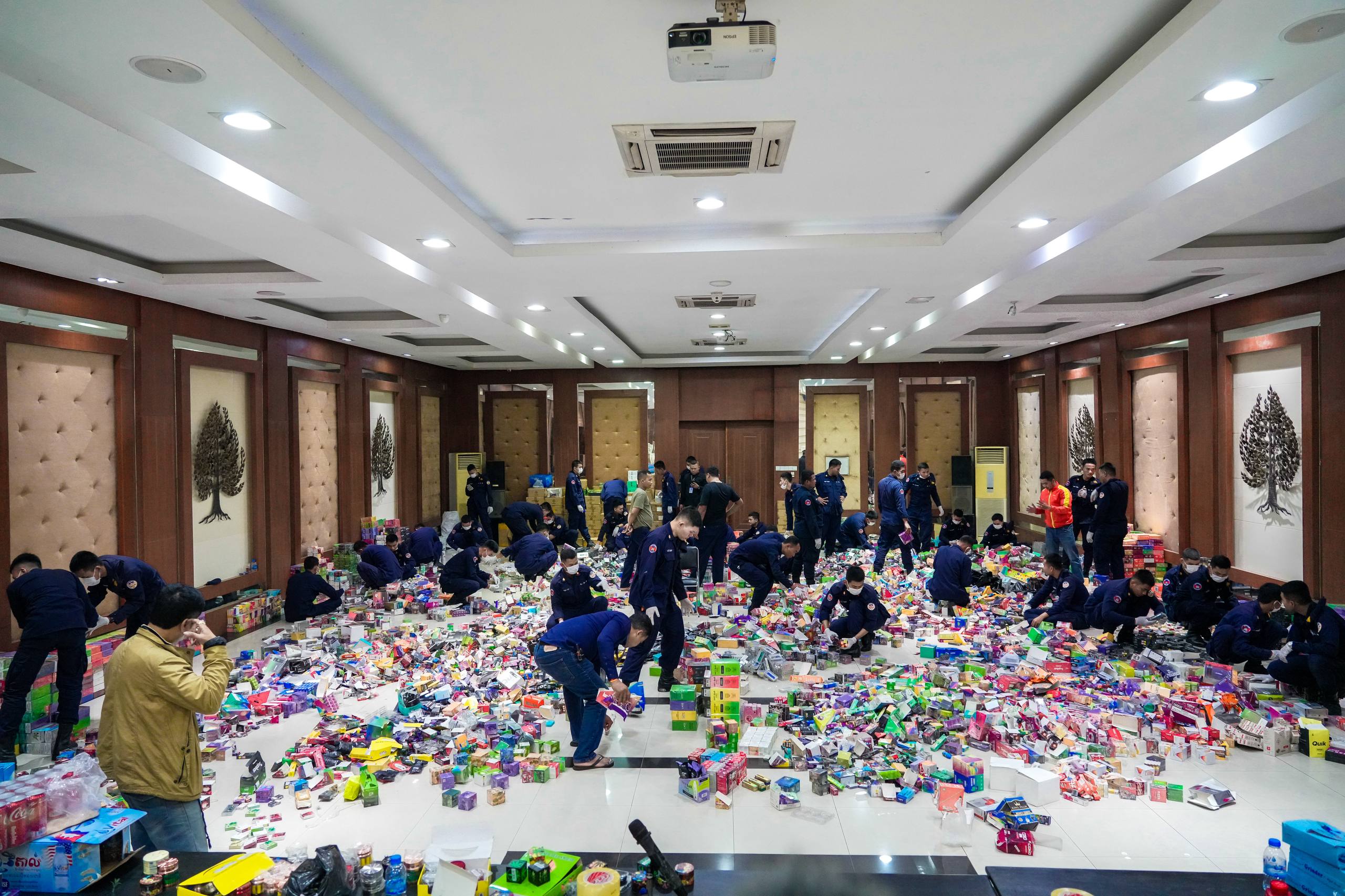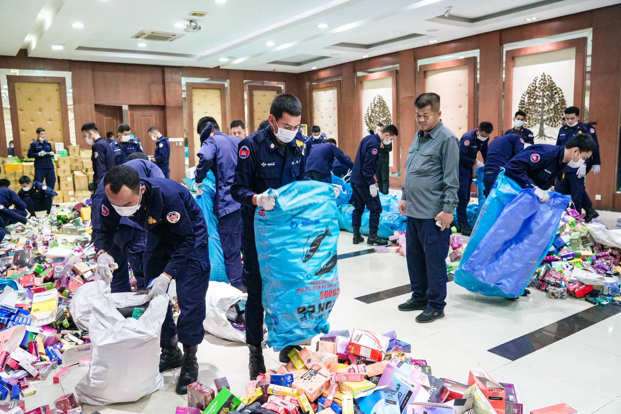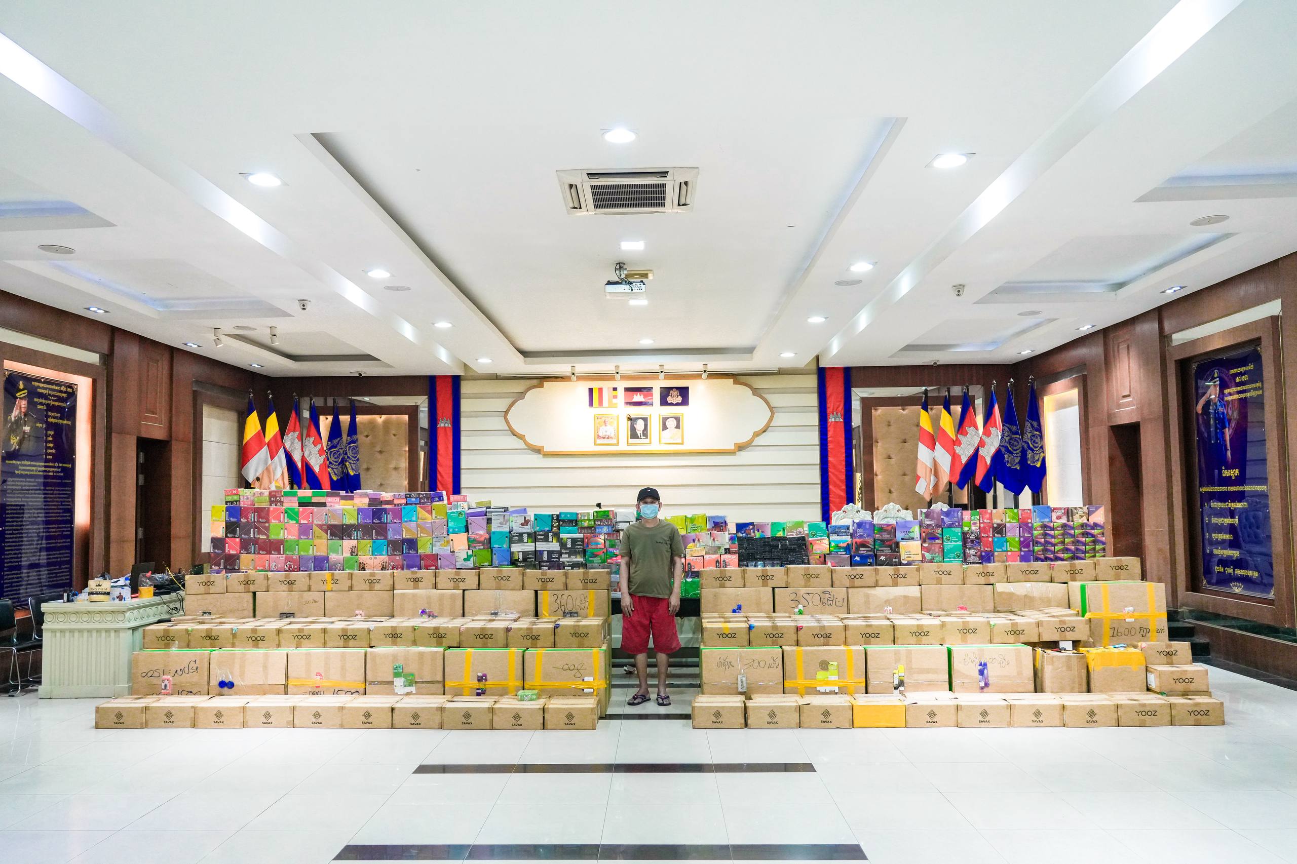ក្នុងនោះសមត្ថកិច្ចដកហូតបាន វត្ថុតាងរួមមាន ម៉ាសុីនជក់ចម្រុះម៉ាក ចំនួន២៦៨,៥០៤ម៉ាសុីន, ក្បាលជក់ចម្រុះម៉ាក ចំនួន៦៩,៦១៥ក្បាល ទឹកVape (វេប) ចំនួន៧៩២ដប និងម៉ាសុីនកិនកញ្ឆា ចំនួន៤៤៣ម៉ាស៊ីន ព្រមទាំងឃាត់ខ្លួនម្ចាស់ទីតាំង បញ្ជូនទៅបញ្ជាការដ្ឋានកងរាជអាវុធហត្ថរាជធានីភ្នំពេញ ដើម្បីចាត់ការតាមនីតិវិធីច្បាប់ ដែលករណីដូចគ្នានេះ អាវុធហត្ថរាជធានីភ្នំពេញ តែងធ្វើការទប់ស្កាត់ និងបង្ក្រាបជាច្រើនកន្លែងមកហើយ។