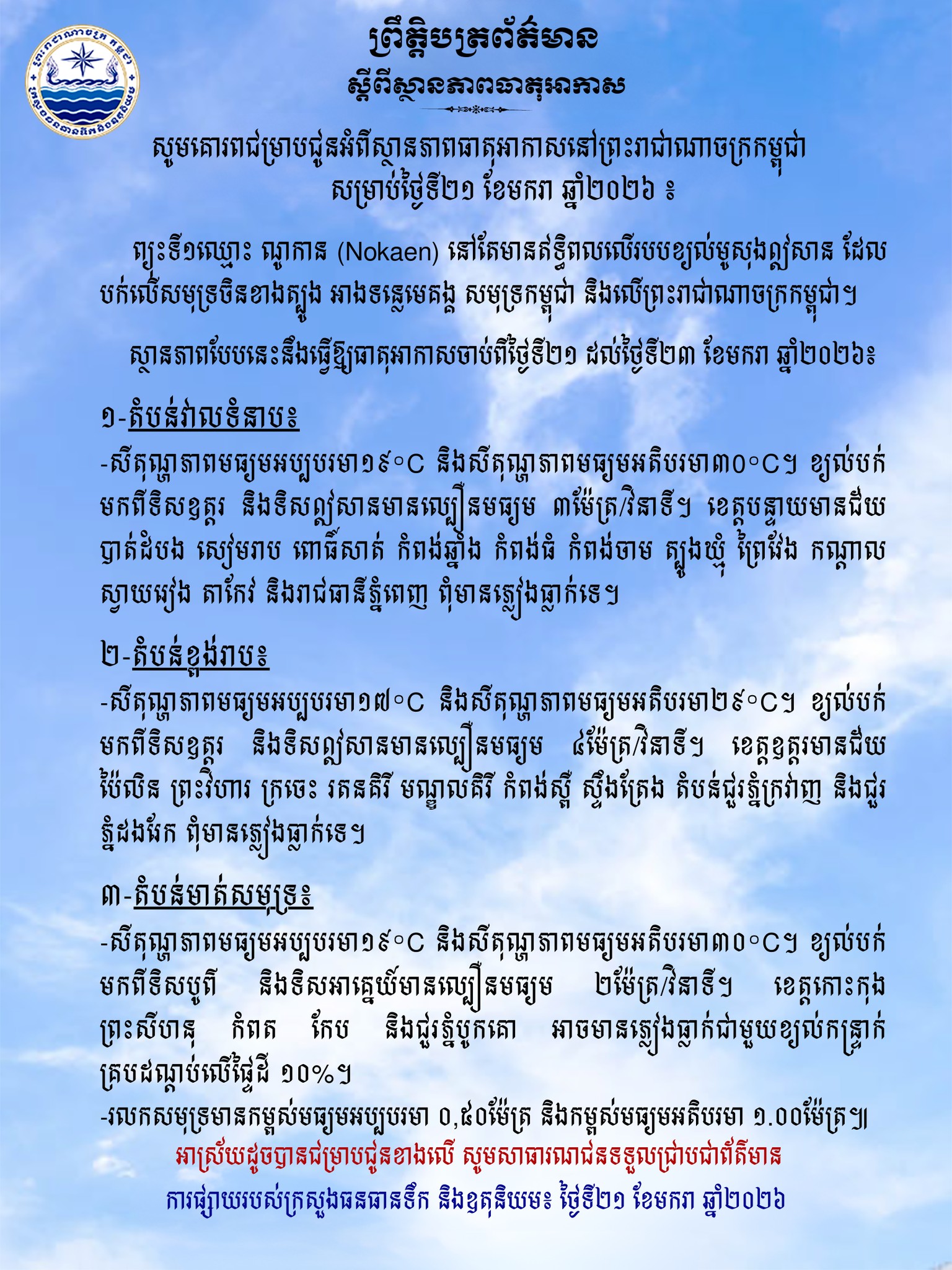 ក្រសួងធនធានទឹក ជូនដំណឹងអំពីស្ថានភាពធាតុអាកាសនៅកម្ពុជា សម្រាប់ថ្ងៃទី២១ ខែមករា ឆ្នាំ២០២៦