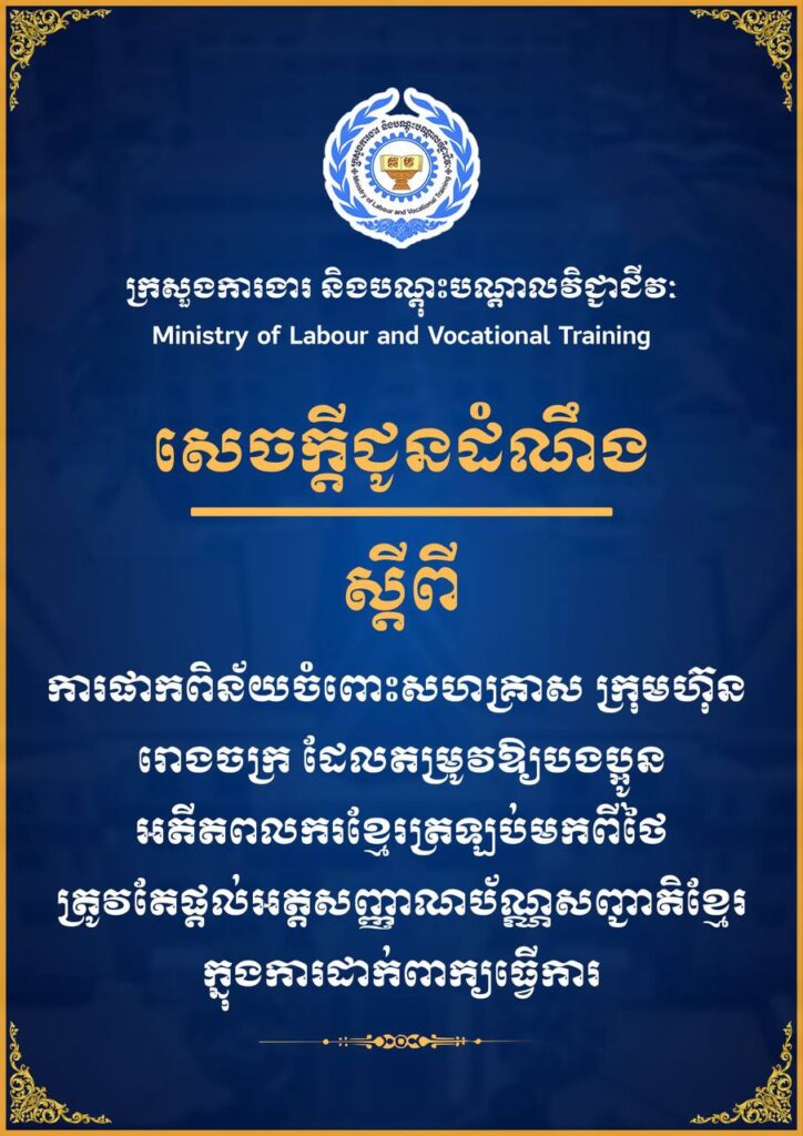 ក្រសួងការងារ និងបណ្តុះបណ្តាលវិជ្ជាជីវៈ ព្រមានផាកពិន័យចំពោះម្ចាស់ ឬនាយកសហគ្រាស ក្រុមហ៊ុន រោងចក្រ ទាំងឡាយណាដែលទាមទារ និងតម្រូវឱ្យអតីតពលករខ្មែរដែលត្រឡប់មកពីថៃ ត្រូវតែផ្តល់នូវអត្តសញ្ញាណប័ណ្ណសញ្ជាតិខ្មែរក្នុងការដាក់ពាក្យធ្វើការ។
