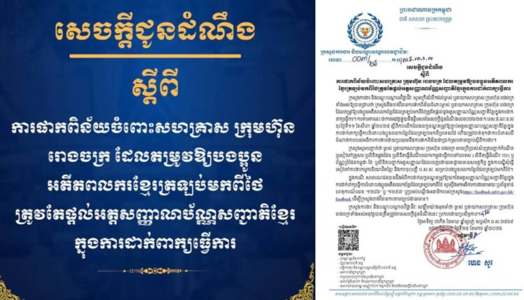 តាមរយៈសេចក្ដីជូនដំណឹងរបស់ក្រសួងការងារ កាលពីថ្ងៃទី២៥​ ខែមករា ឆ្នាំ២០២៦ ក្រសួងការងារ និងបណ្ដុះបណ្ដាលវិជ្ជាជិវៈ បញ្ជាក់ថា ម្ចាស់ ឬនាយកសហគ្រាស ក្រុមហ៊ុន រោងចក្រ អាចប្រើប្រាស់សំបុត្របញ្ជាក់កំណើត ឬសៀវភៅគ្រួសារ ឬលិខិតឆ្លងដែន ឬលិខិតធ្វើដំណើរពលករកម្ពុជាធ្វើការនៅបរទេស (លិខិតធ្វើដំណើរ TD) ឬ ប័ណ្ណព្រំដែនកម្ពុជា-ថៃ ឬលិខិតបញ្ជាក់អត្តសញ្ញាណដែលចេញដោយអាជ្ញាធរមានសមត្ថកិច្ច ក្នុងការស្នើសុំធ្វើ សៀវភៅការងារកម្មករនិយោជិតខ្មែរ និងការចុះបញ្ជី ប.ស.ស. សម្រាប់ពលករខ្មែរដែលត្រឡប់មកពីថៃ។