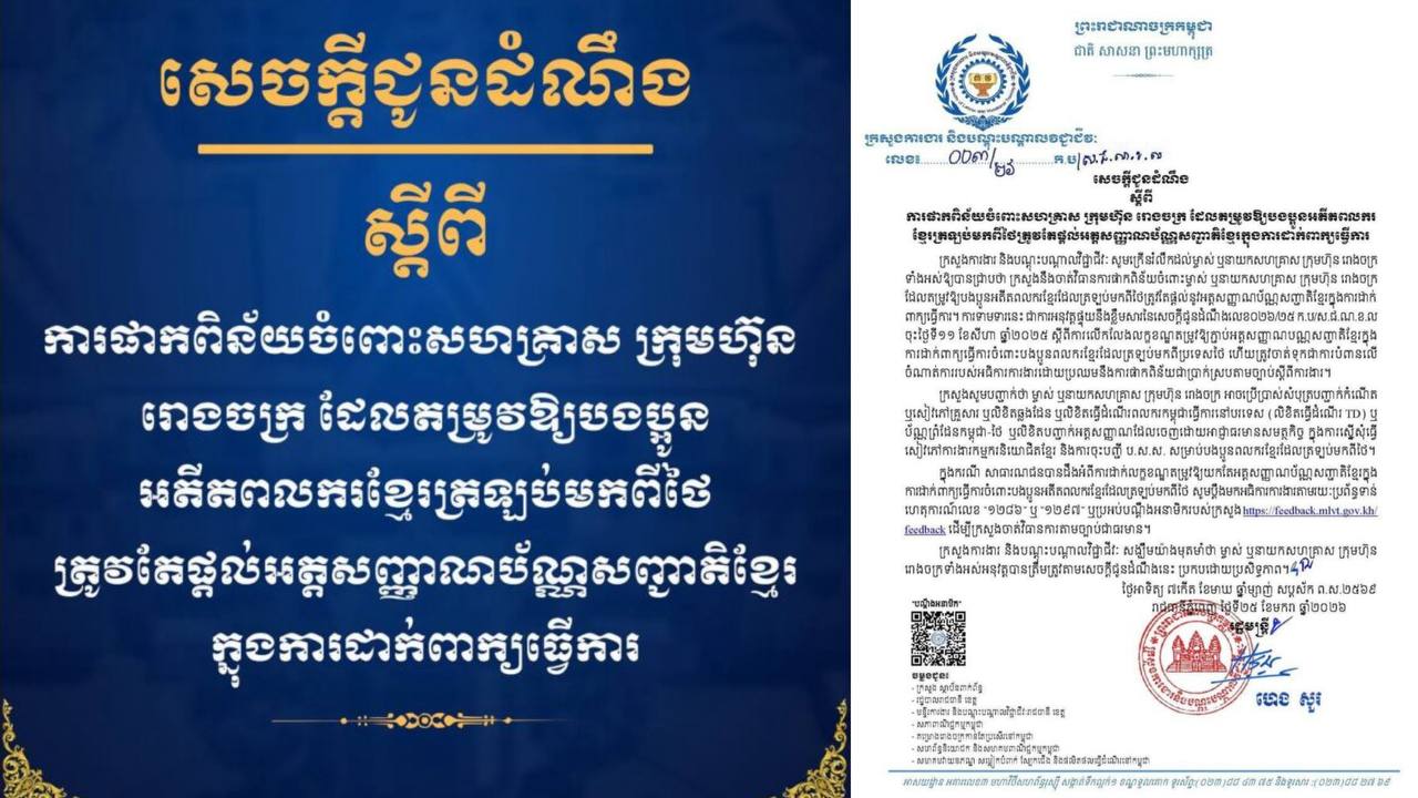 ក្រសួងការងារ ចាត់ទុកការទាមទារនេះ គឺជាការអនុវត្តផ្ទុយនឹងខ្លឹមសារនៃសេចក្តីជូនដំណឹងលេខ ០២៦/២៥ ក.ប/ស.ជ.ណ.ខ.ល ចុះថ្ងៃទី១១ ខែសីហា ឆ្នាំ២០២៥ ស្តីពីការលើកលែងលក្ខខណ្ឌតម្រូវឱ្យភ្ជាប់អត្តសញ្ញាណប័ណ្ណសញ្ជាតិខ្មែរក្នុងការដាក់ពាក្យធ្វើការចំពោះពលករខ្មែរដែលត្រឡប់មកពីប្រទេសថៃ ហើយត្រូវចាត់ទុកជាការបំពានលើចំណាត់ការរបស់អធិការការងារដោយប្រឈមនឹងការផាកពិន័យជាប្រាក់ស្របតាមច្បាប់ស្តីពីការងារ។