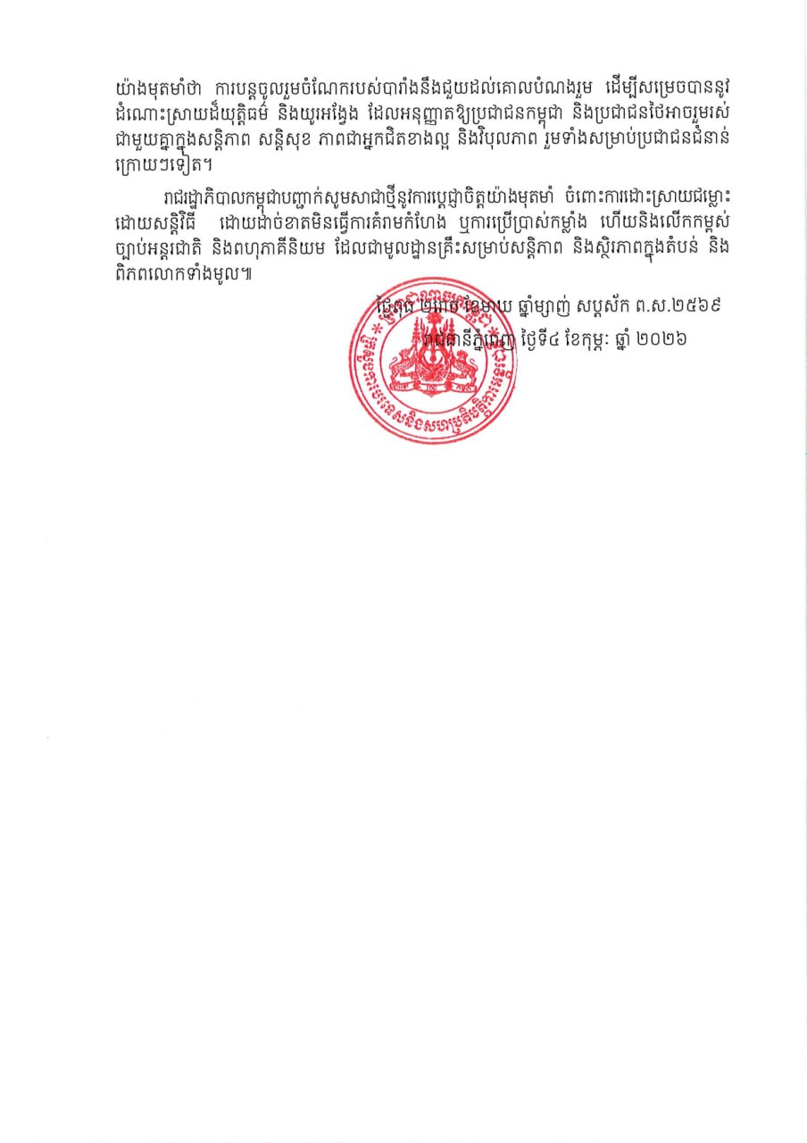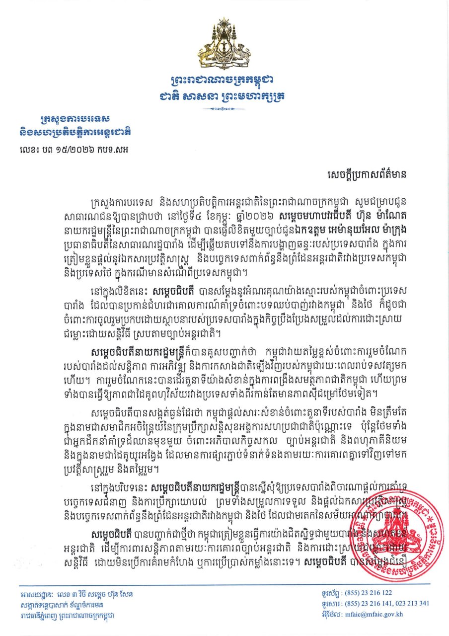 សម្តេចមហាបវរធិបតី ហ៊ុន ម៉ាណែត នាយករដ្ឋមន្ត្រីនៃព្រះរាជាណាចក្រកម្ពុជា ផ្ញើលិខិតមួយច្បាប់ជូនឯកឧត្តម អេម៉ានុយអែល ម៉ាក្រុង ប្រធានាធិបតីនៃសាធារណរដ្ឋបារាំង ដើម្បីឆ្លើយតបទៅនឹងការបង្ហាញឆន្ទៈរបស់ប្រទេសបារាំង ក្នុងការត្រៀមខ្លួនផ្តល់នូវឯកសារប្រវត្តិសាស្ត្រ និងបច្ចេកទេសពាក់ព័ន្ធនឹងព្រំដែនអន្តរជាតិរវាងប្រទេសកម្ពុជា និងប្រទេសថៃ។