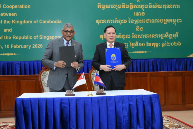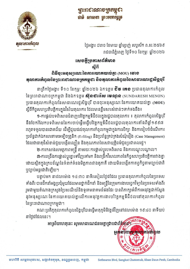 (ភ្នំពេញ)៖ លោក ជីវ កេង ប្រធានតុលាការកំពូលកម្ពុជា និងលោក ស៊ុនដារ៉េស មេណុន (SUNDARESH MENON) ប្រធានតុលាការកំពូលសិង្ហបុរី បានចុះអនុស្សរណៈ នៃការយោគយល់គ្នា (MOU) ស្តីពីកិច្ចសហប្រតិបត្តិការ ក្នុងវិស័យតុលាការ នាព្រឹកថ្ងៃអង្គារ ទី១០ ខែកុម្ភៈ ឆ្នាំ២០២៦។