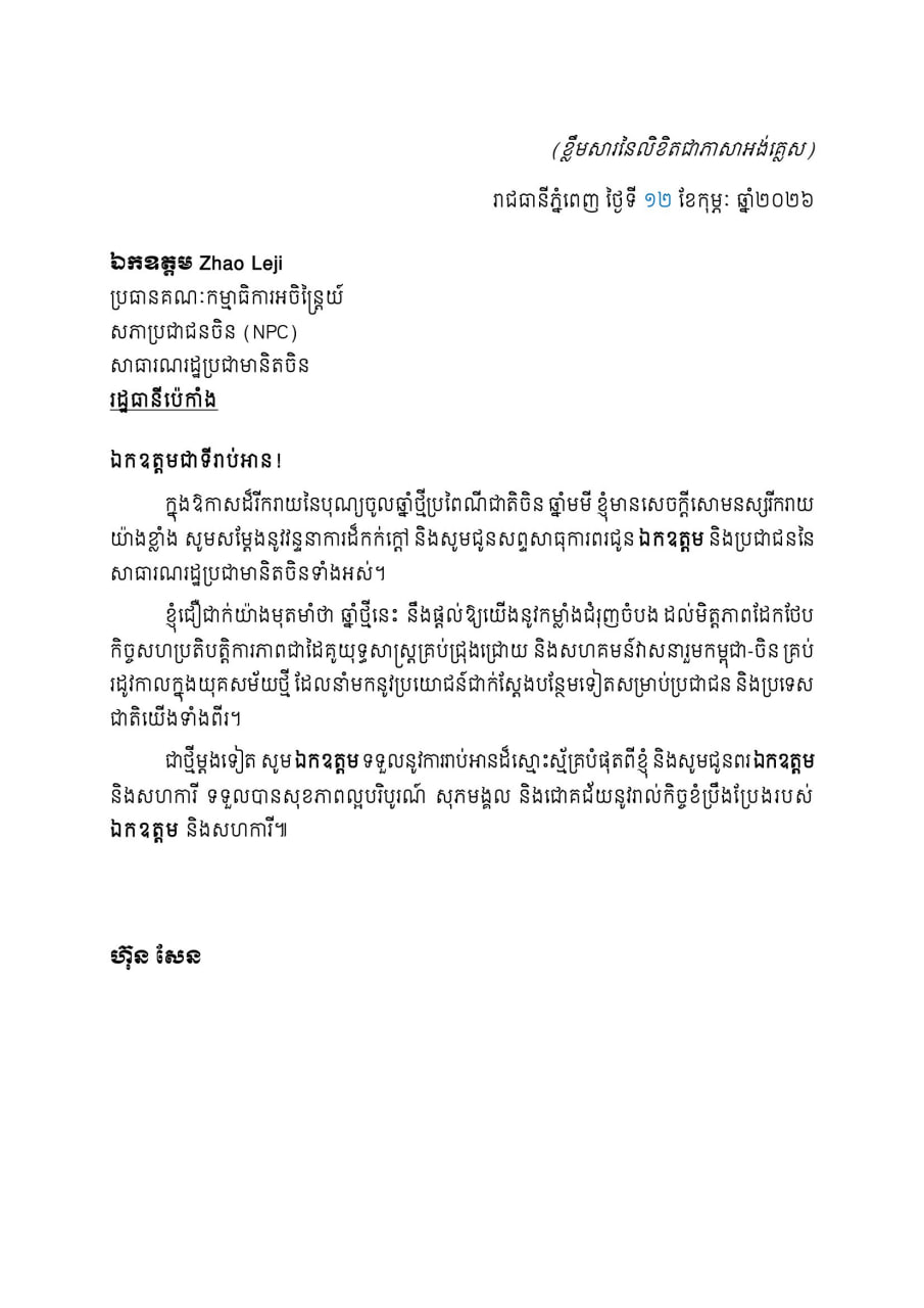 សម្តេចតេជោ ហ៊ុន សែន ផ្ញើសារជូនពរលោក Zhao Leji ប្រធានគណៈកម្មាធិការអចិន្ត្រៃយ៍សភាប្រជាជនចិន ក្នុងឱកាសពិធីបុណ្យចូលឆ្នាំថ្មីប្រពៃណីជាតិចិន