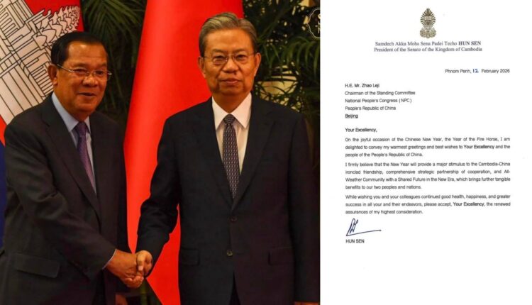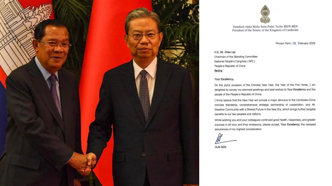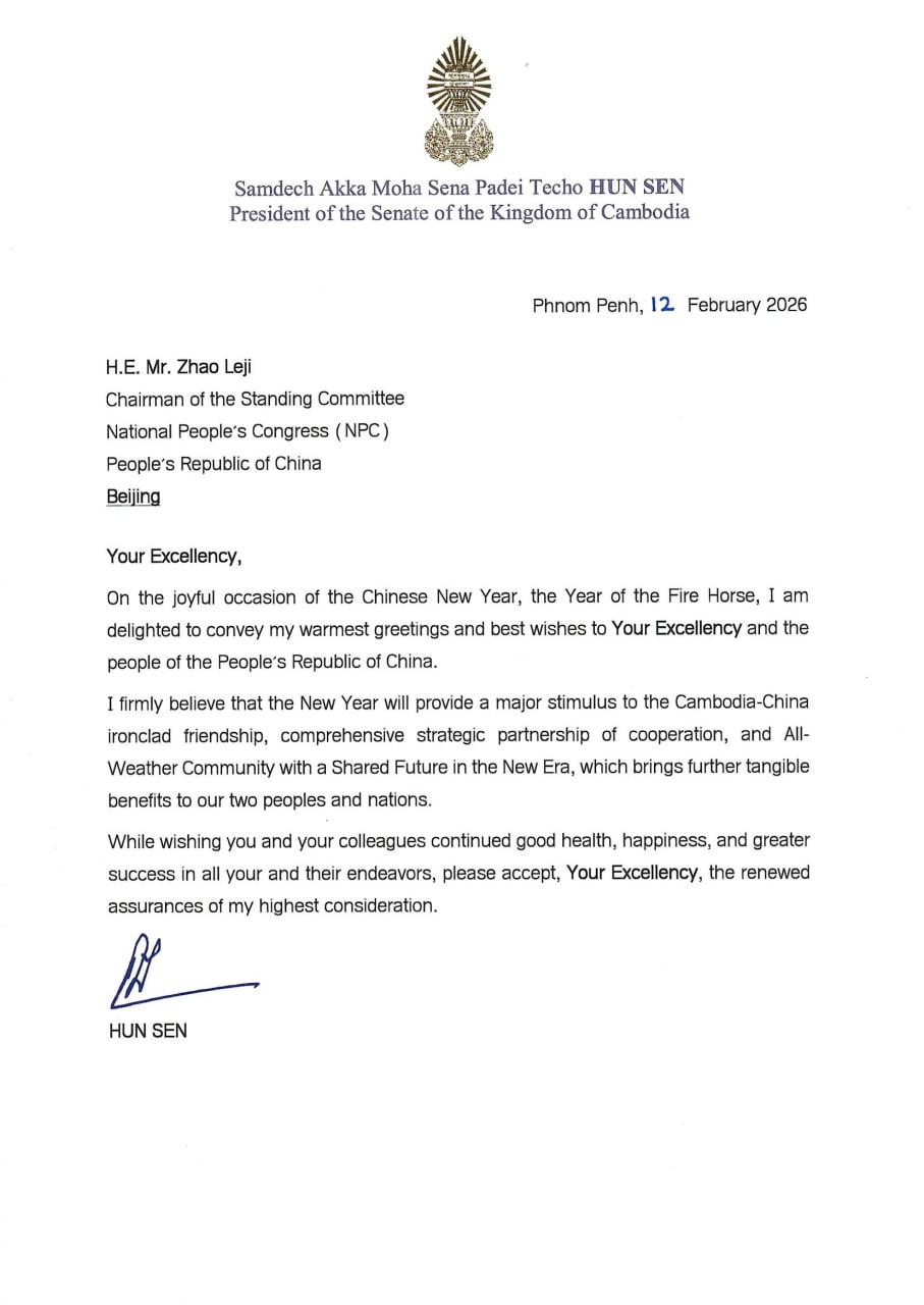 (ភ្នំពេញ)៖ សម្តេចតេជោ ហ៊ុន សែន ប្រធានព្រឹទ្ធសភាកម្ពុជា បានផ្ញើសារលិខិតជូនពរ លោក Zhao Leji ប្រធានគណៈកម្មាធិការអចិន្ត្រៃយ៍សភាប្រជាជនចិន (NPC) សាធារណរដ្ឋប្រជាមានិតចិន ក្នុងឱកាសពិធីបុណ្យចូលឆ្នាំថ្មីប្រពៃណីជាតិចិន។