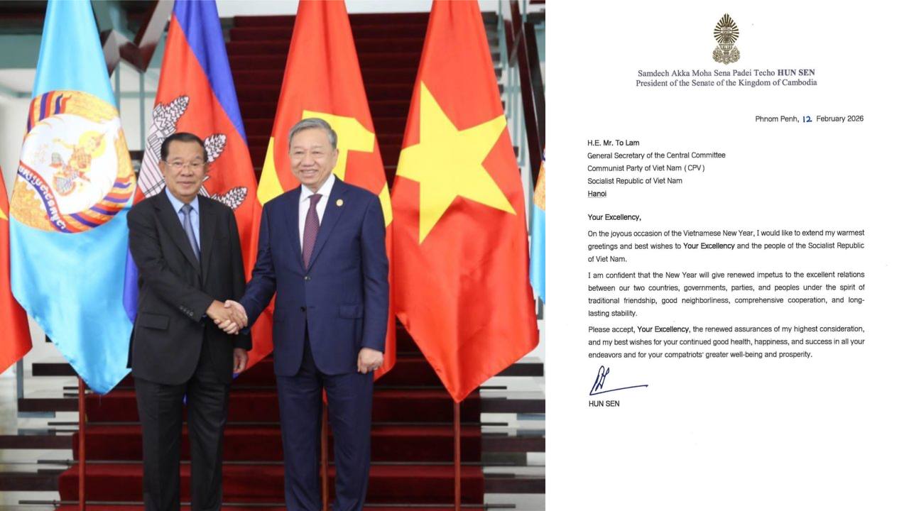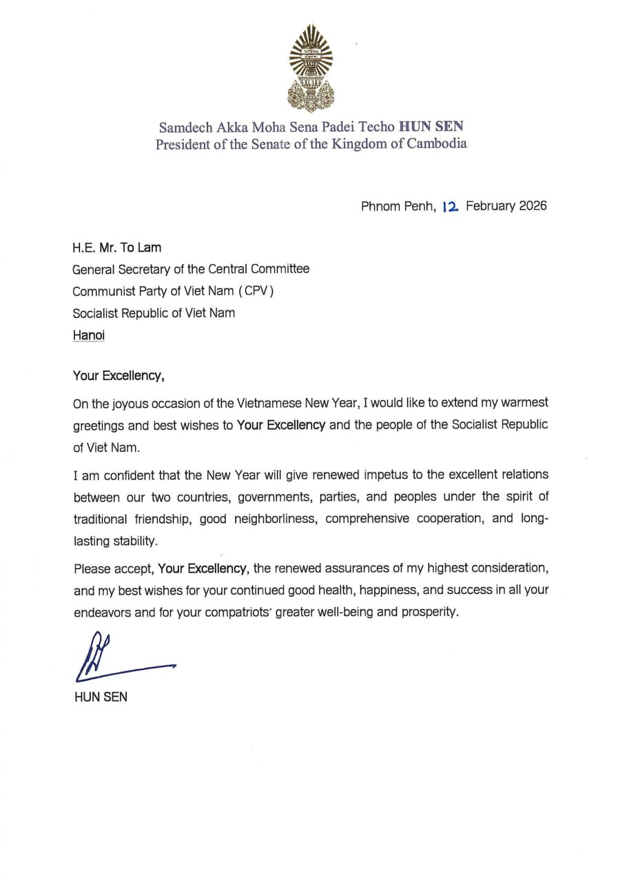 (ភ្នំពេញ)៖ សម្តេចតេជោ ហ៊ុន សែន ប្រធានព្រឹទ្ធសភាកម្ពុជា បានផ្ញើសារលិខិតជូនពរលោក លោក តូ ឡឹម អគ្គលេខាធិការនៃគណៈកម្មាធិការមជ្ឈិមបក្សកុម្មុយនីស្តវៀតណាម ក្នុងឱកាសពិធីបុណ្យចូលឆ្នាំថ្មីប្រពៃណីជាតិវៀតណាម។