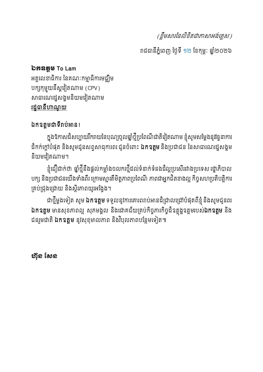 សារលិខិតរបស់សម្តេចតេជោ ហ៊ុន សែន មានខ្លឹមសារដូច្នេះថា៖ «ក្នុងឱកាសដ៏សប្បាយរីករាយនៃបុណ្យចូលឆ្នាំថ្មីប្រពៃណីជាតិវៀតណាម ខ្ញុំសូមសម្តែងនូវវន្ទនាករ ដ៏កក់ក្តៅបំផុត និងសូមជូនសព្ទសាធុការពរ ជូនចំពោះ ឯកឧត្តម និងប្រជាជន នៃសាធារណរដ្ឋសង្គម និយមវៀតណាម។