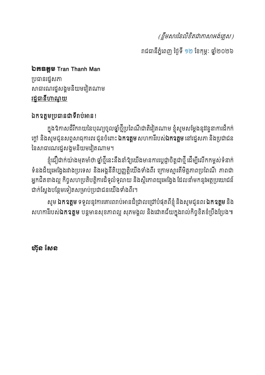 ខ្ញុំជឿជាក់យ៉ាងមុតមាំថា ឆ្នាំថ្មីនេះនឹងនាំឱ្យយើងមានការប្តេជ្ញាចិត្តជាថ្មី ដើម្បីលើកកម្ពស់ទំនាក់ ទំនងដ៏យូរអង្វែងរវាងប្រទេស និងអង្គនីតិប្បញ្ញត្តិយើងទាំងពីរ ក្រោមស្មារតីមិត្តភាពប្រពៃណី ភាពជា អ្នកជិតខាងល្អ កិច្ចសហប្រតិបត្តិការដ៏ទូលំទូលាយ និងស្ថិរភាពយូរអង្វែង ដែលនាំមកនូវអត្ថប្រយោជន៍ ជាក់ស្តែងបន្ថែមទៀតសម្រាប់ប្រជាជនយើងទាំងពីរ។