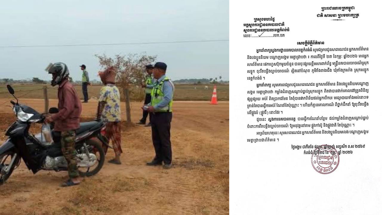 ការចេញបញ្ជារបស់ស្នងការនគរបាលខេត្តកំពង់ធំ ធ្វើឡើងបន្ទាប់ពីមហាជននៅលើបណ្ដាញសង្គមចែកចាយរូបភាពនគរបាលចរាចរណ៍នៅស្រុកសន្ទុក ចុះរឹតបន្តឹងច្បាប់ចរាចរណ៍ ស្ថិតនៅចំណុចភូមិវាំងខាងជើង ឃុំតាំងក្រសាំង ស្រុកសន្ទុក ខេត្តកំពង់ធំ (លើផ្លូវលំ) កាលពីថ្ងៃទី២៣ ខែកុម្ភៈ ឆ្នាំ២០២៦។