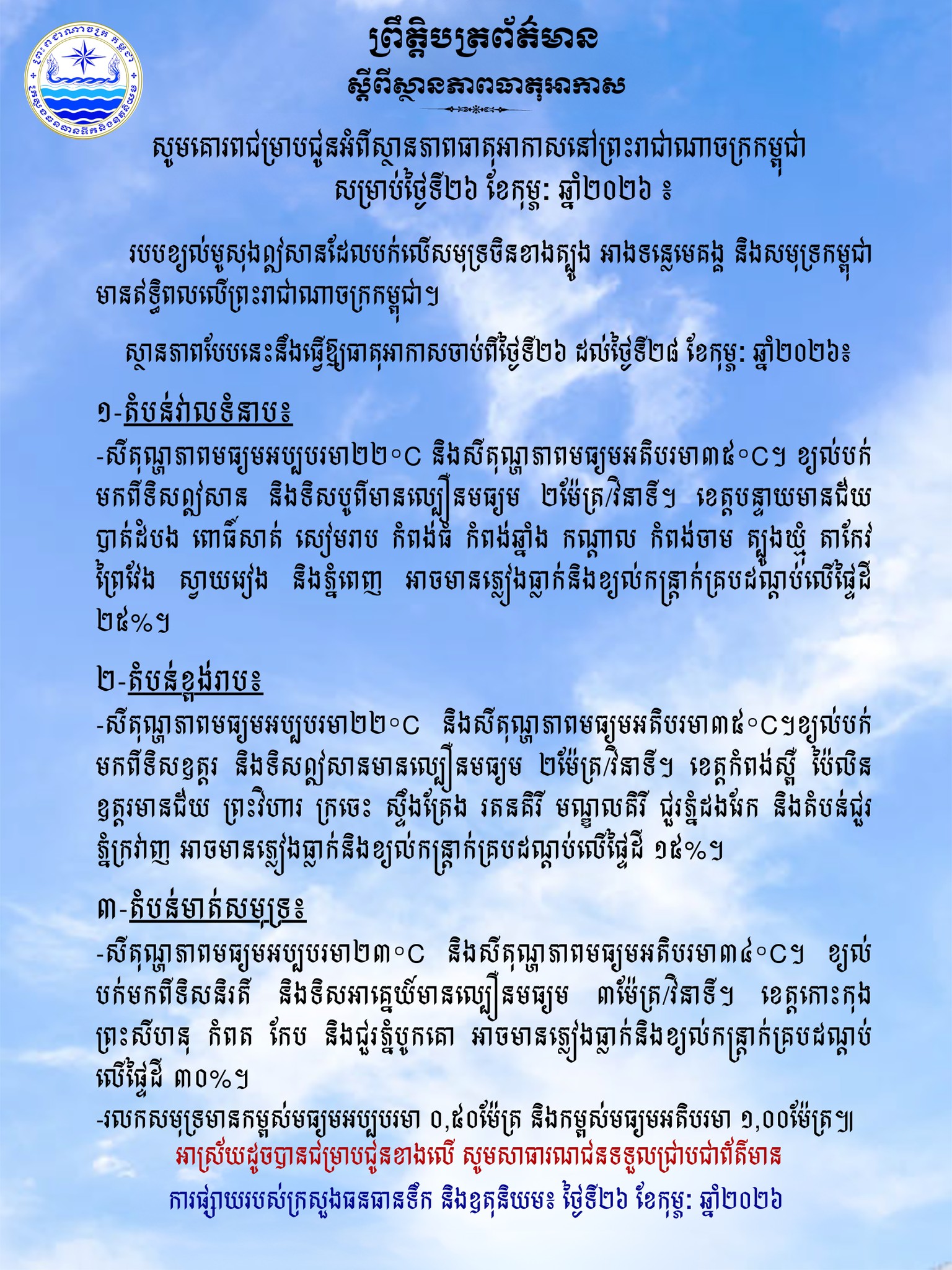 ក្រសួងធនធានទឹក ជូនដំណឹងអំពីស្ថានភាពធាតុអាកាសនៅកម្ពុជា សម្រាប់ថ្ងៃទី២៦ ខែកុម្ភៈ ឆ្នាំ២០២៦