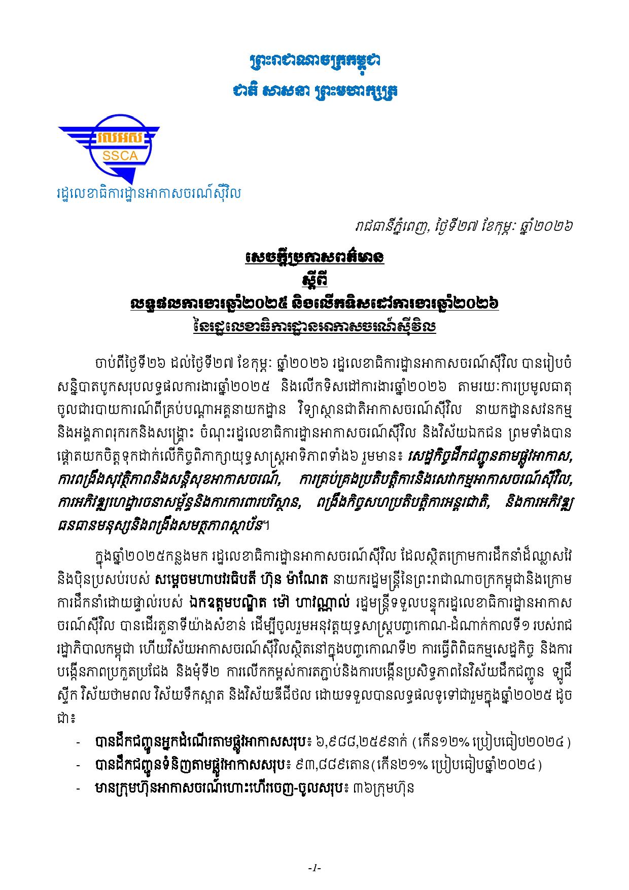(ភ្នំពេញ)៖ រដ្ឋលេខាធិការដ្ឋានអាកាសចរណ៍ស៊ីវិល បានរៀបចំសន្និបាតបូកសរុបលទ្ធផលការងារឆ្នាំ២០២៥ និងលើកទិសដៅការងារឆ្នាំ២០២៦រយៈពេល២ថ្ងៃ ចាប់ពីថ្ងៃទី២៦ ដល់ថ្ងៃទី២៧ ខែកុម្ភៈ ឆ្នាំ២០២៦ ដោយបានប្រមូលធាតុចូលជារបាយការណ៍ពីគ្រប់បណ្តាអគ្គនាយកដ្ឋាន វិទ្យាស្ថានជាតិអាកាសចរណ៍ស៊ីវិល នាយកដ្ឋានសវនកម្ម និងអង្គភាពរុករកនិងសង្គ្រោះ ចំណុះរដ្ឋលេខាធិការដ្ឋានអាកាសចរណ៍ស៊ីវិល និងវិស័យឯកជន។