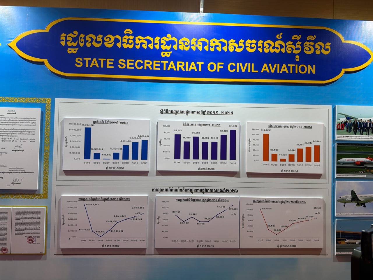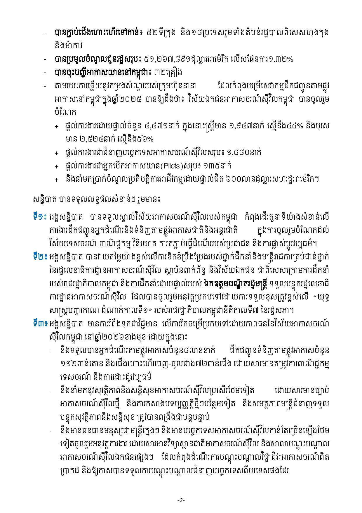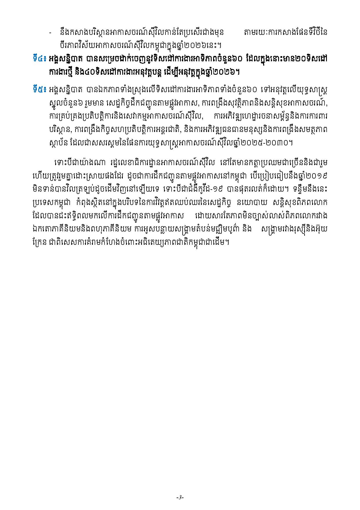 ទី៣៖ អង្គសន្និបាត មានការរំពឹងទុកជាវិជ្ជមាន លើការរីកចម្រើប្រកបទៅដោយភាពធននៃវិស័យអាកាសចរណ៍ស៊ីវិលកម្ពុជា នៅឆ្នាំ២០២៦ខាងមុខ ដោយក្នុងនោះ នឹងទទួលបានអ្នកដំណើរតាមផ្លូវអាកាសចំនួន៨លាននាក់ ដឹកជញ្ជូនទំនិញតាមផ្លូវអាកាសចំនួន១១២ពាន់តោន និងជើងហោះហើរចេញ-ចូលជាង៧២ពាន់ជើង ដោយសារមានតម្រូវការពាណិជ្ជកម្ម ទេសចរណ៍ និងការដោះដូរវប្បធម៌ ក៏ដូចជានឹងនាំមកនូវសុវត្ថិភាពនិងសន្តិសុខអាកាសចរណ៍ស៊ីវិលប្រសើរថែមទៀត ដោយសារមានច្បាប់អាកាសចរណ៍ស៊ីវិលថ្មី និងការកសាងបទប្បញ្ញត្តិថ្មីៗបន្ថែមទៀត និងសមត្ថភាពមន្ត្រីជំនាញទទួលបន្ទុកសុវត្ថិភាពនិងសន្តិសុខ ត្រូវបានពង្រឹងជាបន្តបន្ទាប់, មានធនធានមនុស្សជាមន្ត្រីក្មេងៗ និងមានបច្ចេកទេសអាកាសចរណ៍ស៊ីវិលកាន់តែច្រើនឡើងថែមទៀតចូលរួមអនុវត្តការងារ ដោយសារមានវិទ្យាស្ថានជាតិអាកាសចរណ៍ស៊ីវិល និងសាលាបណ្តុះបណ្តាល អាកាសចរណ៍ស៊ីវិលឯកជនផ្សេងៗ ដែលកំពុងដំណើរការបណ្តុះបណ្តាលវិជ្ជាជីវៈអាកាសចរណ៍ពិតប្រាកដ និងឱ្យកាសបានទទួលការបណ្តុះបណ្តាលជំនាញបច្ចេកទេសពីបរទេសផងដែរ, នឹងកសាងបរិស្ថានអាកាសចរណ៍ស៊ីវិលកាន់តែប្រសើរជាងមុន តាមរយៈការកសាងផែនទីវិថីនៃ ចីរភាពវិស័យអាកាសចរណ៍ស៊ីវិលកម្ពុជាក្នុងឆ្នាំ២០២៦នេះ។
