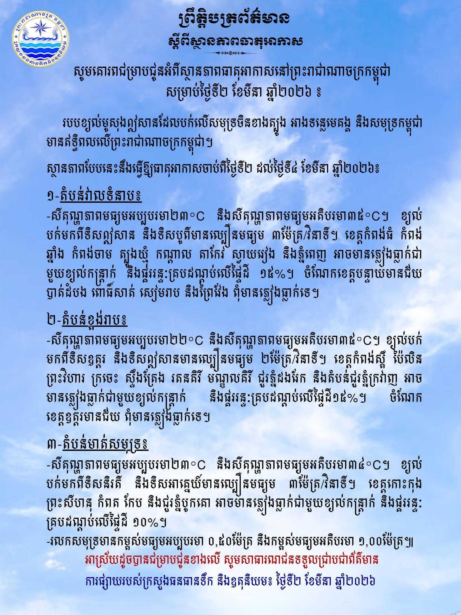 ក្រសួងធនធានទឹក ជូនដំណឹងអំពីស្ថានភាពធាតុអាកាសនៅកម្ពុជា សម្រាប់ថ្ងៃទី២ ខែមីនា ឆ្នាំ២០២៦