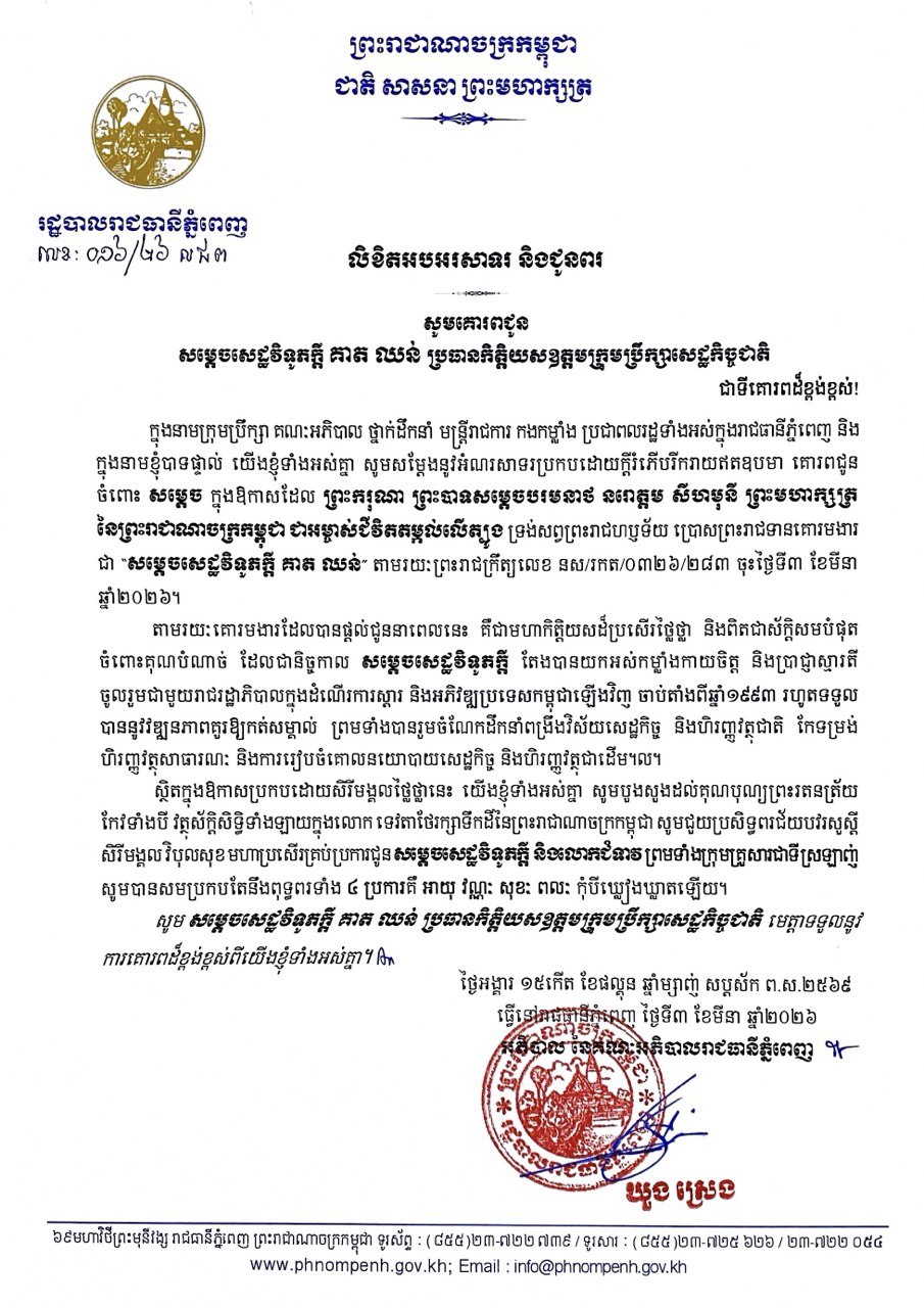 (ភ្នំពេញ)៖ ឯកឧត្តម ឃួង ស្រេង អភិបាលរាជធានីភ្នំពេញ ព្រមទាំងក្រុមប្រឹក្សា គណៈអភិបាល មន្រ្តីរាជការ និងកងកម្លាំងប្រដាប់អាវុធទាំងអស់ និងលោកជំទាវ បានផ្ញើសារលិខិតសូមចូលរួមអបអរសាទរ និងគោរពជូនពរ ឯកឧត្តមកិត្តិបរិរក្សបណ្ឌិត គាត ឈន់ ប្រធានកិត្តិយសឧត្តមក្រុមប្រឹក្សាសេដ្ឋកិច្ច ក្នុងឱកាសត្រូវបាន ព្រះករុណាជាអម្ចាស់ជីវិតលើត្បូង ជាទីគោរពសក្ការៈដ៏ខ្ពង់ខ្ពស់បំផុត ព្រះអង្គសព្វព្រះរាជហឫទ័យ ប្រោសព្រះរាជទានគោរមងារជា «សម្តេចសេដ្ឋវិទូភក្តី គាត ឈន់» តាមរយៈព្រះរាជក្រឹត្យ ចុះថ្ងៃទី០៣ ខែមីនា ឆ្នាំ២០២៦។
