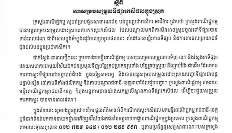 ក្រសួងពាណិជ្ជកម្ម ប្រកាសឱ្យប្រជាកសិករទាក់ទងមកមន្ទីរពាណិជ្ជកម្មរាជធានី-ខេត្ត ឬក្រសួង បើជួបករណីកកស្ទះកសិផល