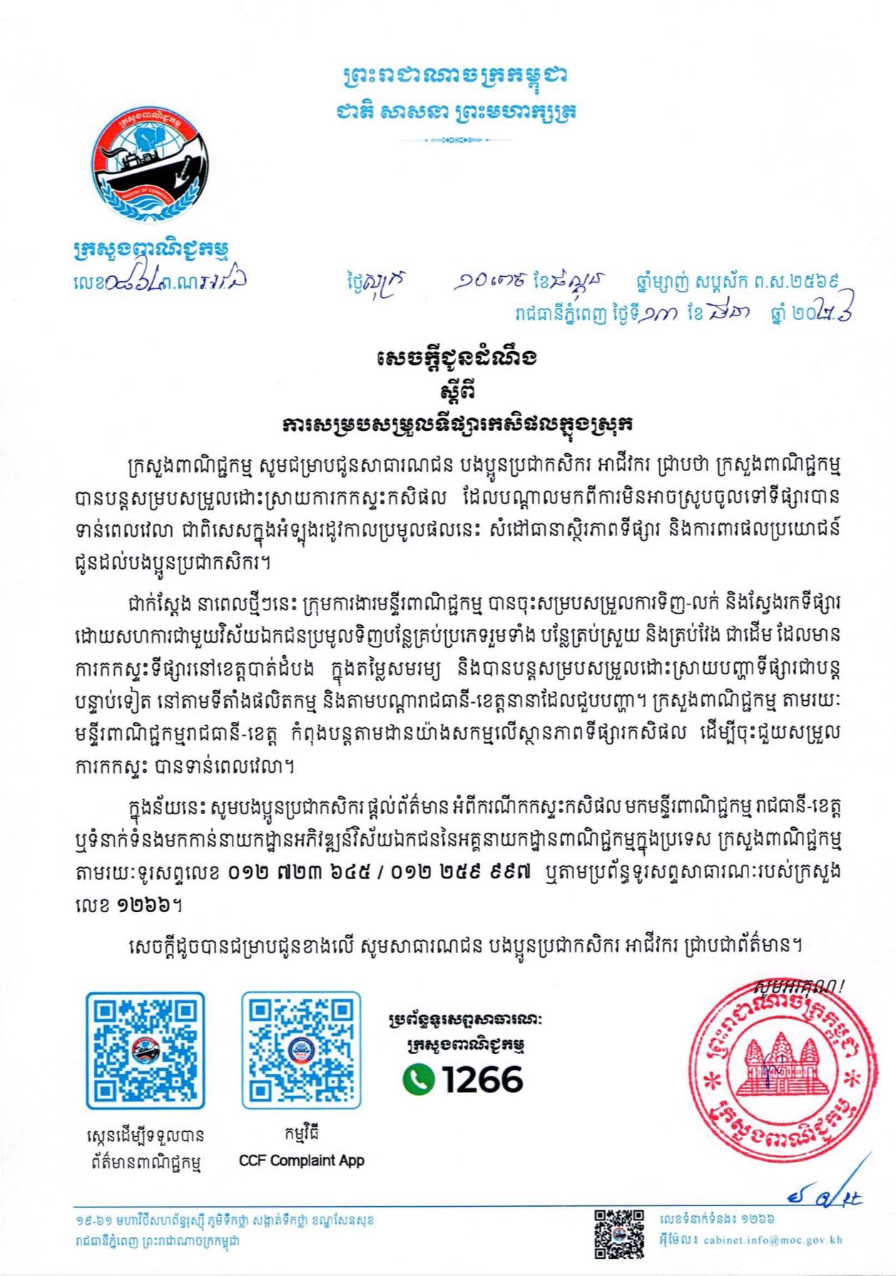 (ភ្នំពេញ)៖ ក្រសួងពាណិជ្ជកម្ម នៅថ្ងៃទី១៣ ខែមីនា ឆ្នាំ២០២៦នេះ បានចេញសេចក្តីជូនដំណឹងថ្មីមួយ ដោយប្រកាសឱ្យប្រជាកសិករទាក់ទង មកមន្ទីរពាណិជ្ជកម្មរាជធានី-ខេត្ត ឬទាក់ទងមកក្រសួង បើជួបករណីកកស្ទះកសិផល។