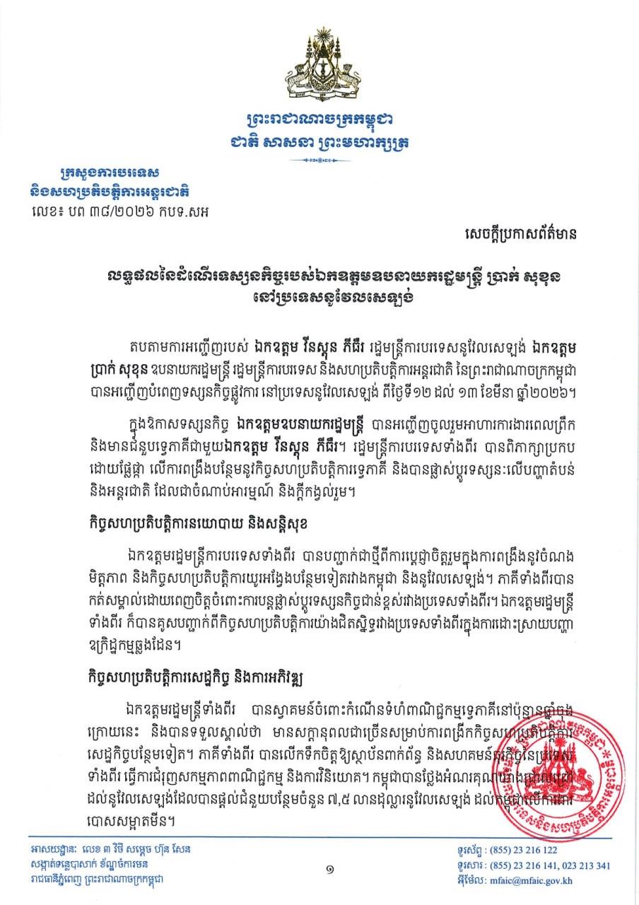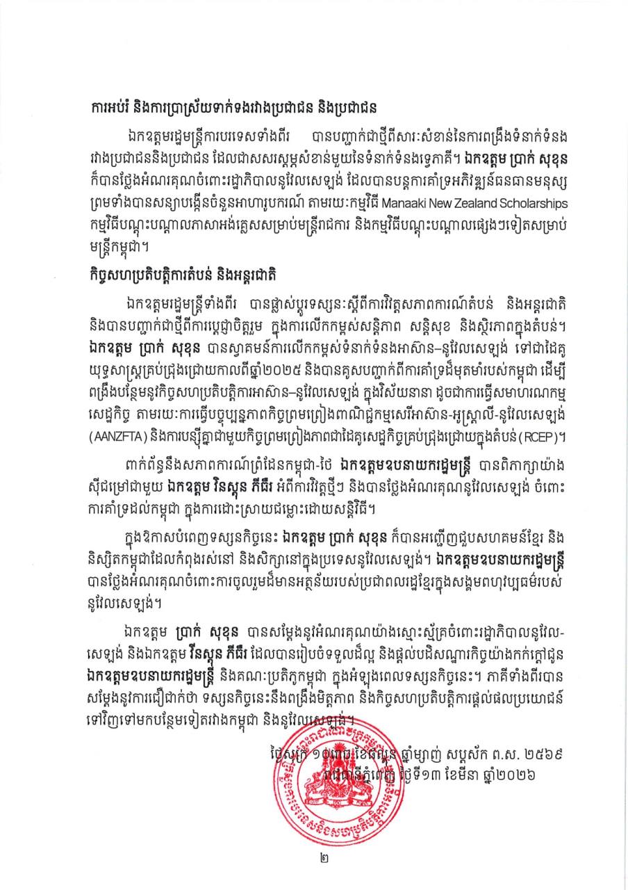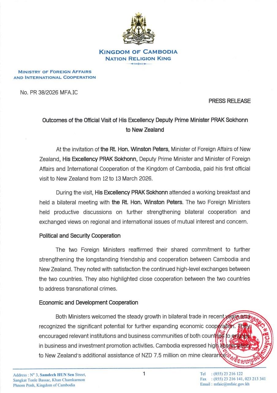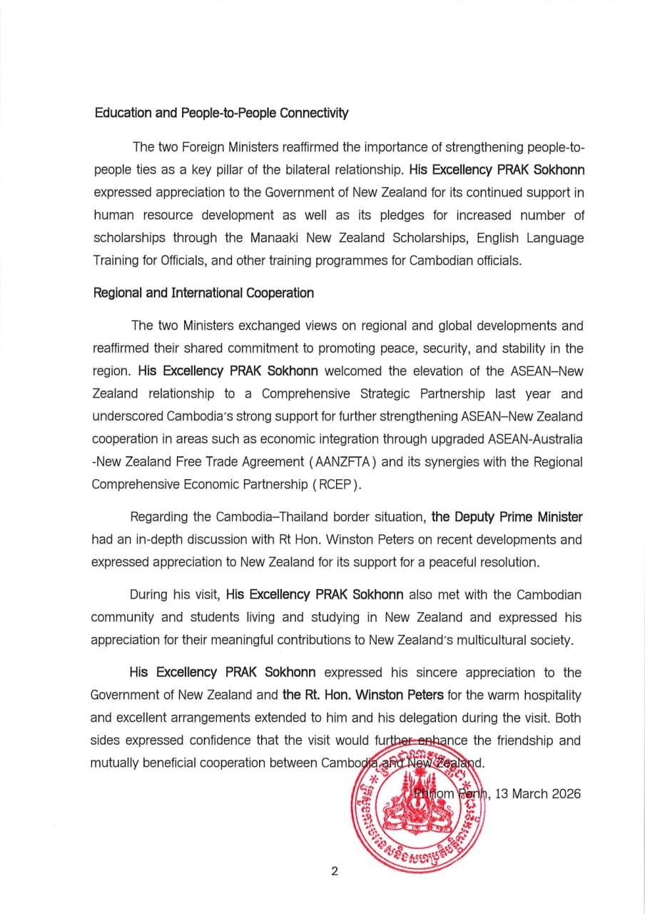 (ភ្នំពេញ)៖ ក្រសួងការបរទេស និងសហប្រតិបត្តិការអន្តរជាតិ នៅថ្ងៃទី១៣ ខែមីនា ឆ្នាំ២០២៦នេះ បានបង្ហាញលទ្ធផលនៃដំណើរទស្សនកិច្ចរបស់លោកឧបនាយករដ្ឋមន្ត្រី ប្រាក់ សុខុន តបតាមការអញ្ជើញរបស់លោក វីនស្តុន ភីធឺរ រដ្ឋមន្ត្រីការបរទេសនូវែលសេឡង់ ដែលទៅបំពេញទស្សនកិច្ចផ្លូវការ នៅប្រទេសនូវែលសេឡង់ ពីថ្ងៃទី១២ ដល់ ១៣ ខែមីនា ឆ្នាំ២០២៦។