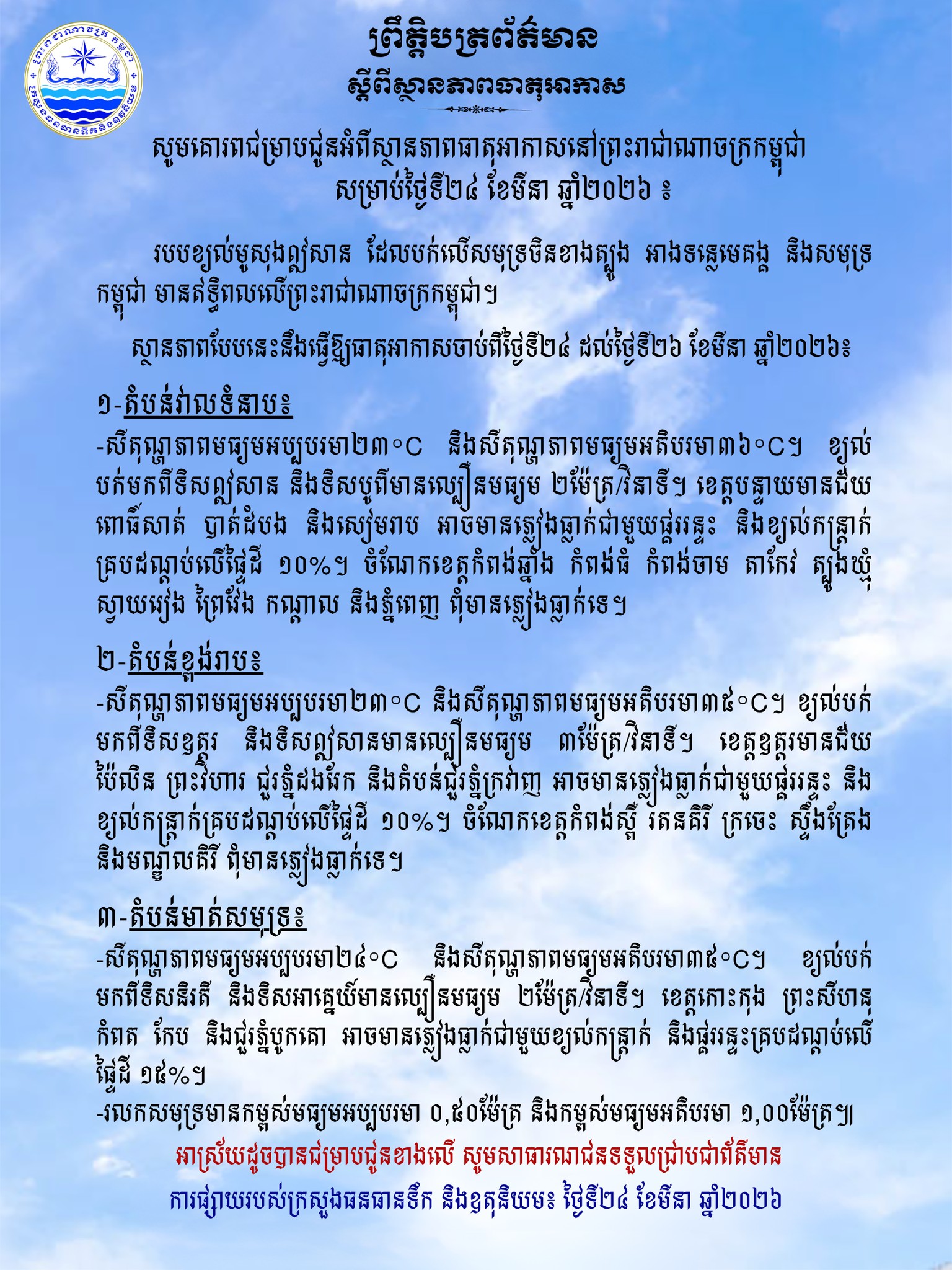 ក្រសួងធនធានទឹក ជូនដំណឹងអំពីស្ថានភាពធាតុអាកាសនៅកម្ពុជា សម្រាប់ថ្ងៃទី២៤ ខែមីនា ឆ្នាំ២០២៦