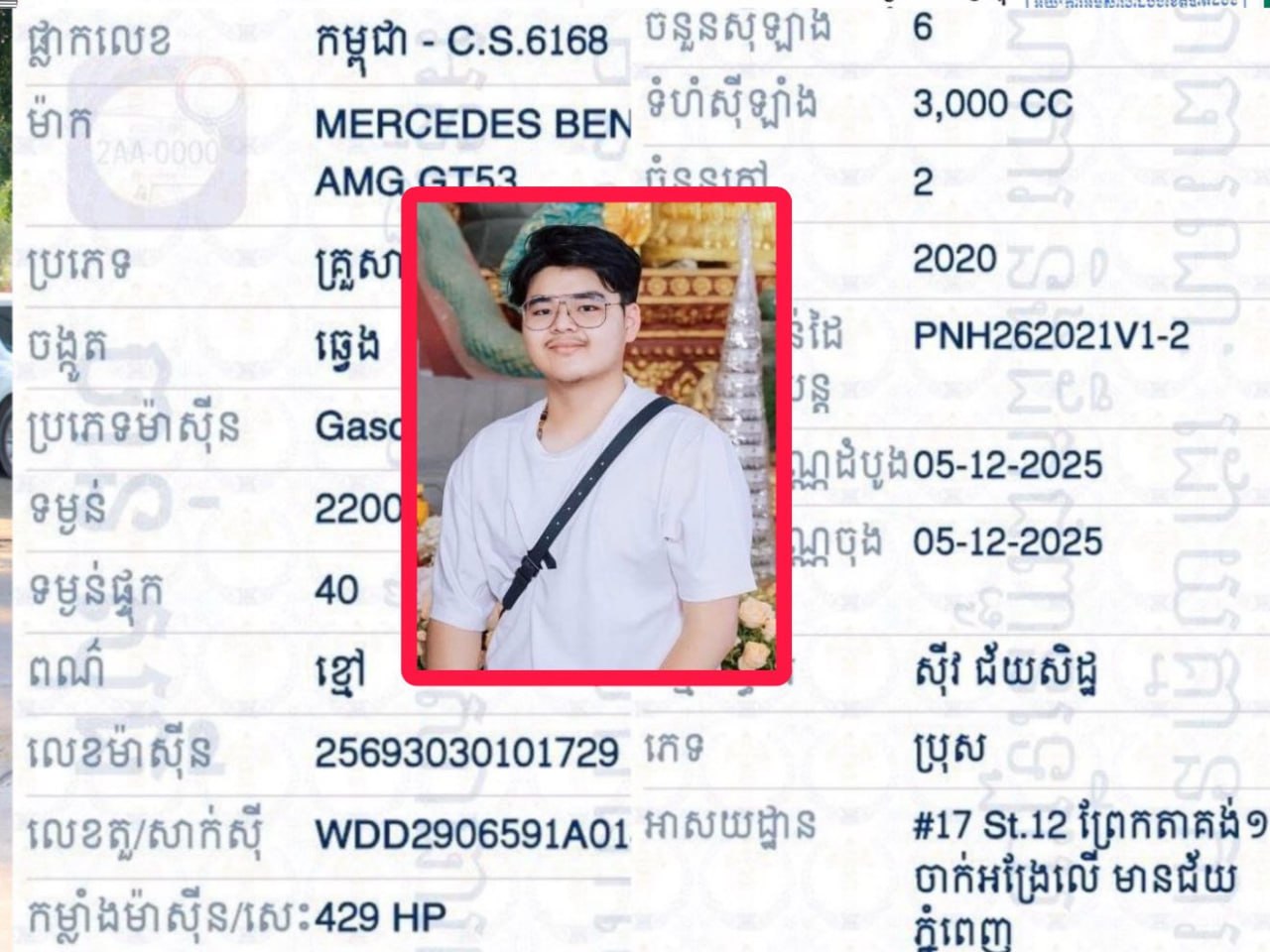 Update ៖ អ្នកបើកបរ រថយន្ដស៊េរីទំនើបមួយគ្រឿង ម៉ាក MERCEDES BENZ AMG GT53 ពណ៌ខ្មៅ ពាក់ស្លាកលេខកម្ពុជា C.S.6168 ដែលបានបុករះម៉ូតូពីរគ្រឿងពេញទំហឹង បណ្ដាលឲ្យមនុស្ស៦នាក់ស្លាប់ រួមទាំងកូនក្នុងផ្ទៃយ៉ាងអណោចអធម៌ រួចជនបង្កគេចខ្លួនបាត់ស្រមោលនោះឥឡូវសមត្ថកិច្ចបានកំណត់មុខសញ្ញានិងអត្តសញ្ញាណច្បាស់លាស់ហើយ។