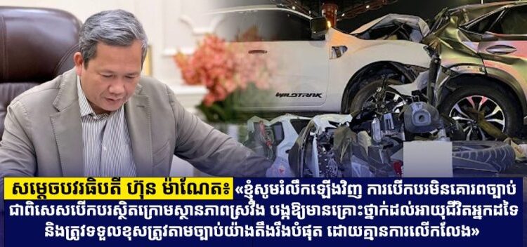 សម្តេចបវរធិបតី ហ៊ុន ម៉ាណែត៖ «ខ្ញុំសូមរំលឹកឡើងវិញ ការបើកបរមិនគោរពច្បាប់ ជាពិសេសបើកបរស្ថិតក្រោមស្ថានភាពស្រវឹង បង្កឱ្យមានគ្រោះថ្នាក់ដល់អាយុជីវិតអ្នកដទៃ និងត្រូវទទួលខុសត្រូវតាមច្បាប់យ៉ាងតឹងរឹងបំផុត ដោយគ្មានការលើកលែង»