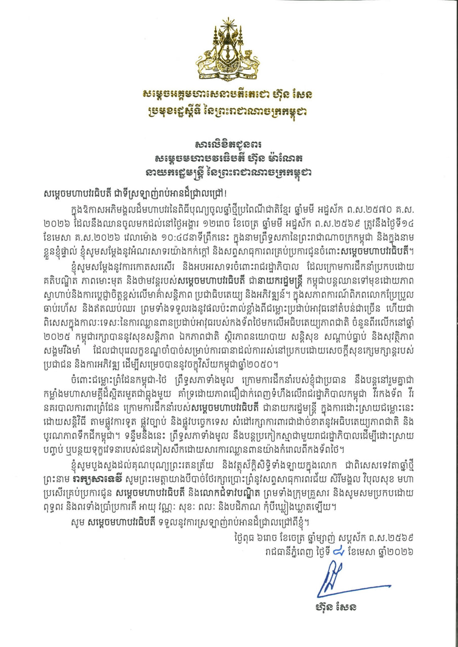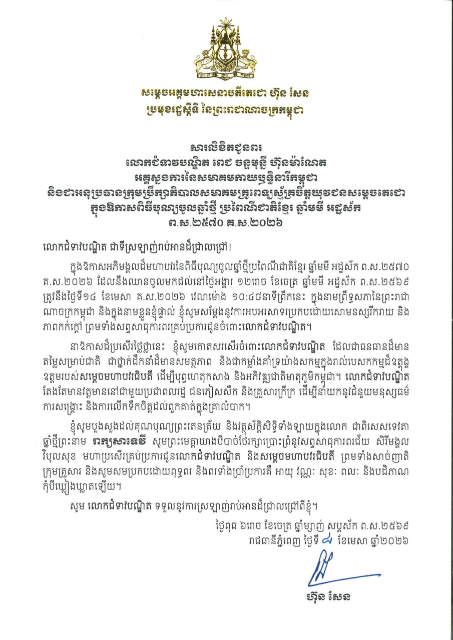 ព័ត៌មានជាតិសម្តេចតេជោ សម្តេចតេជោ ហ៊ុន សែន ផ្ញើសារជូនពរ សម្ដេចធិបតី ហ៊ុន ម៉ាណែត និងលោកជំទាវបណ្ឌិត ព្រមទាំងក្រុមគ្រួសារ ក្នុងឱកាសបុណ្យចូលឆ្នាំថ្មី ឆ្នាំមមី ចេញផ្សាយ ថ្ងៃទី 11 ខែ មេសា ឆ្នាំ 2026 1,050 1,050