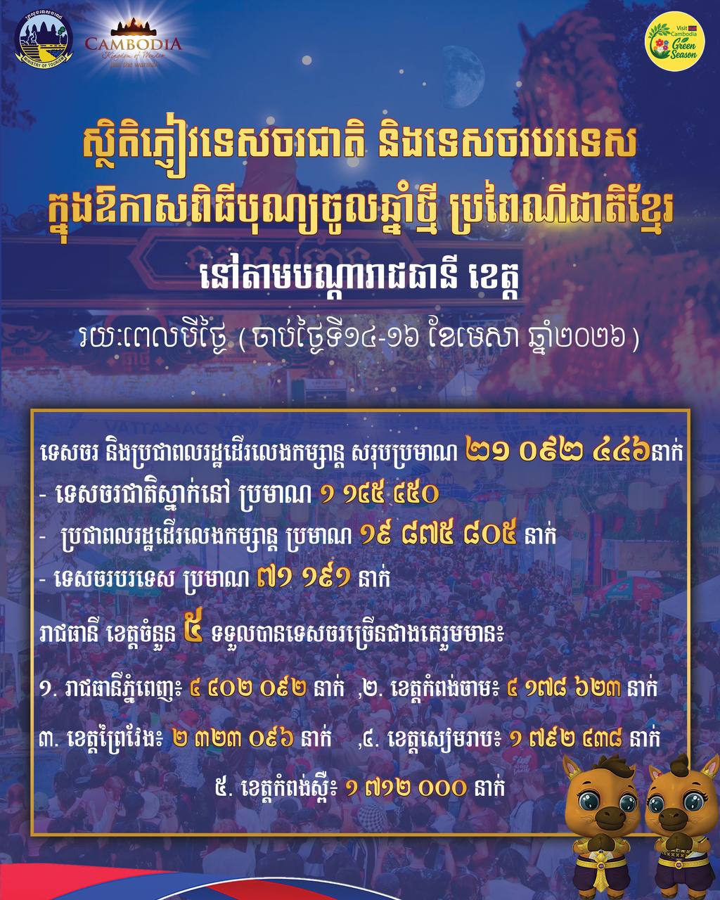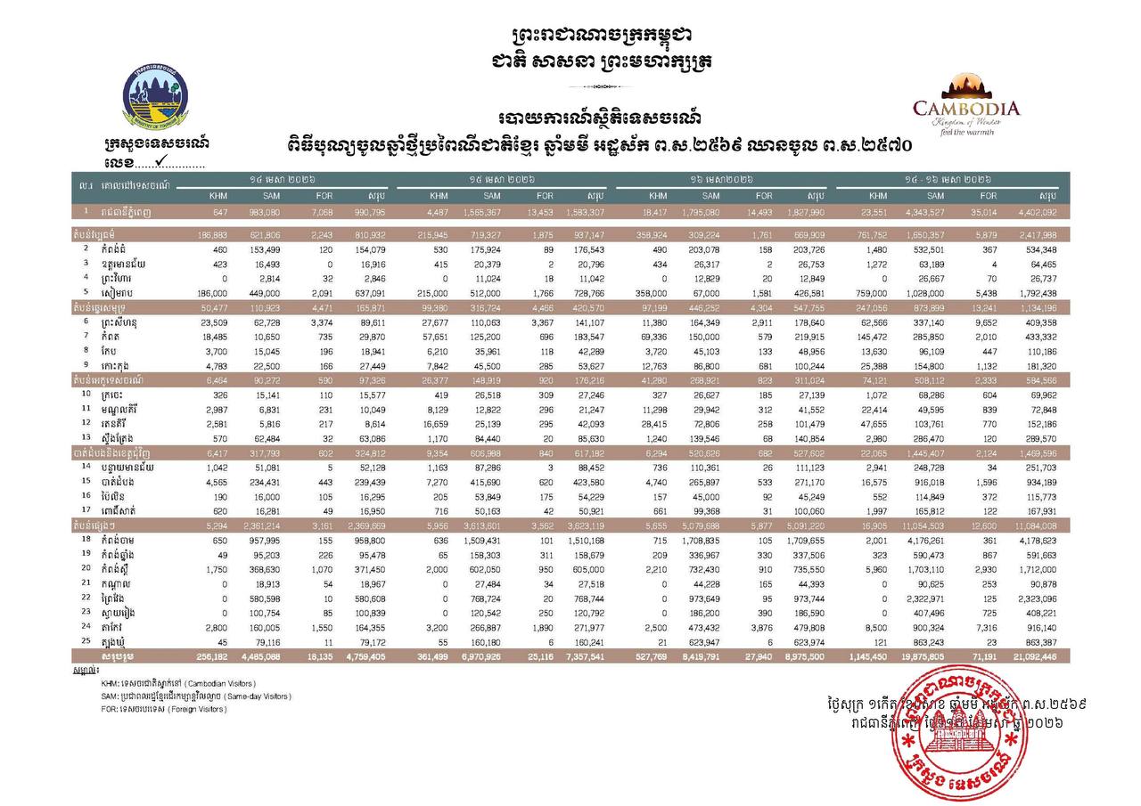 ក្រសួងទេសចរណ៍ឱ្យដឹងថា មានភ្ញៀវទេសចរ និងប្រជាពលរដ្ឋដើរលេងកម្សាន្តសរុបប្រមាណ ២១,០៩២,៤៤៦ នាក់ ក្នុងរយៈពេលបីថ្ងៃ