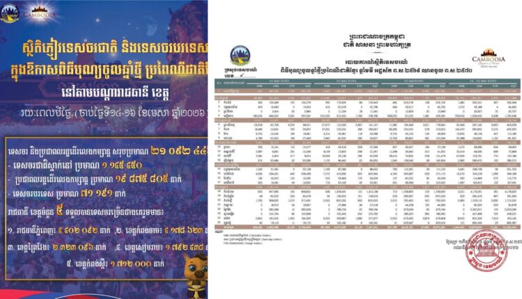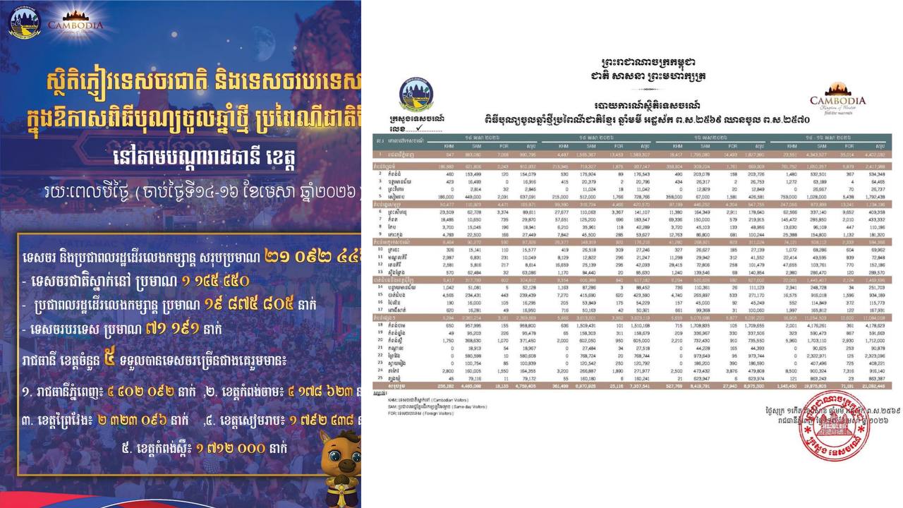 ក្រសួងទេសចរណ៍៖ ភ្ញៀវទេសចរជាតិ និងទេសចរបរទេសជាង ២១លាននាក់ បានដើរលេងកម្សាន្តនៅតាមរាជធានី-ខេត្តទូទាំងប្រទេស ក្នុងឱកាសបុណ្យចូលឆ្នាំថ្មី រយៈពេល៣ថ្ងៃ