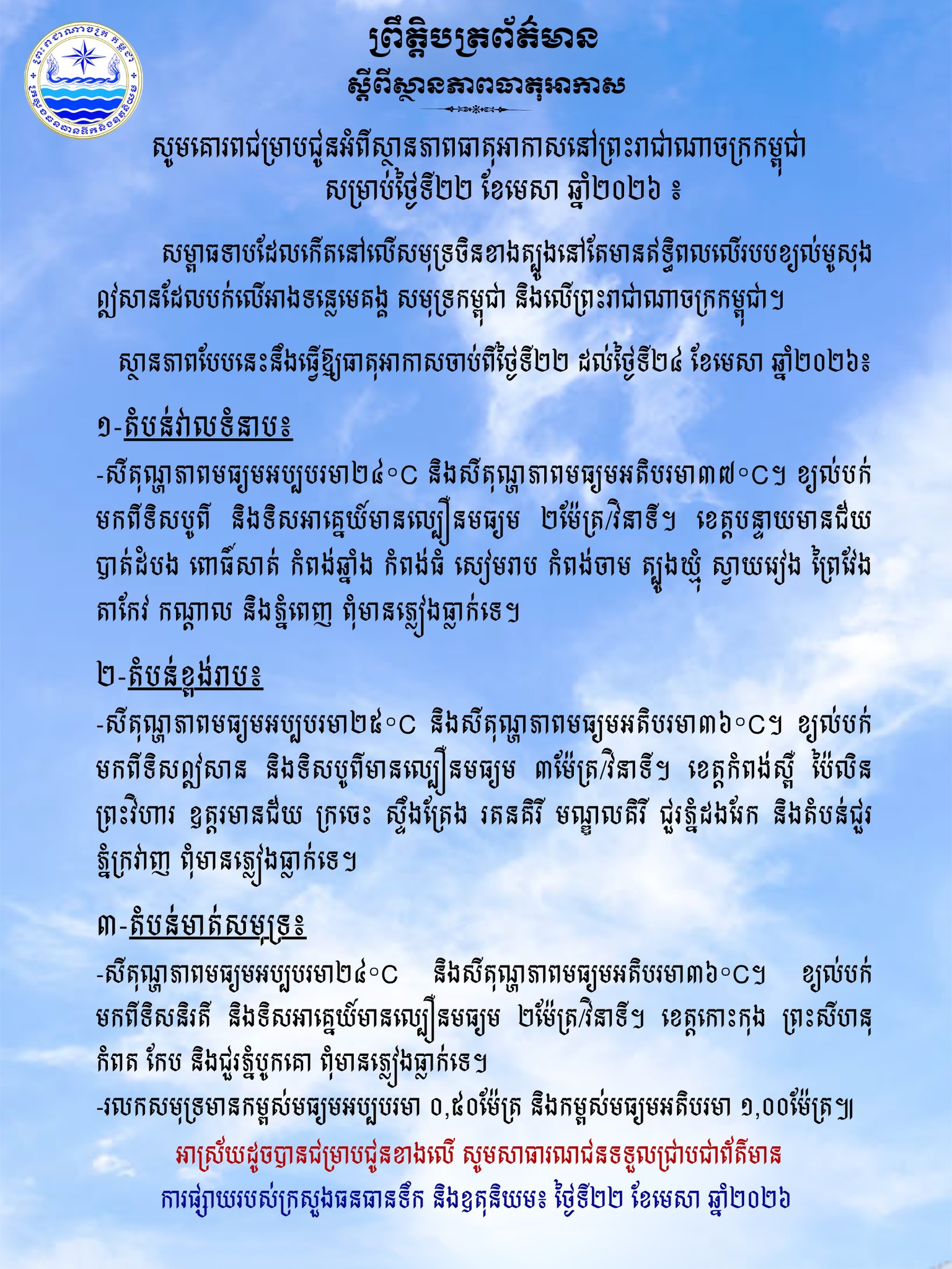 ក្រសួងធនធានទឹក ជូនដំណឹងអំពីស្ថានភាពធាតុអាកាសនៅកម្ពុជា សម្រាប់ថ្ងៃទី២២ ខែមេសា ឆ្នាំ២០២៦