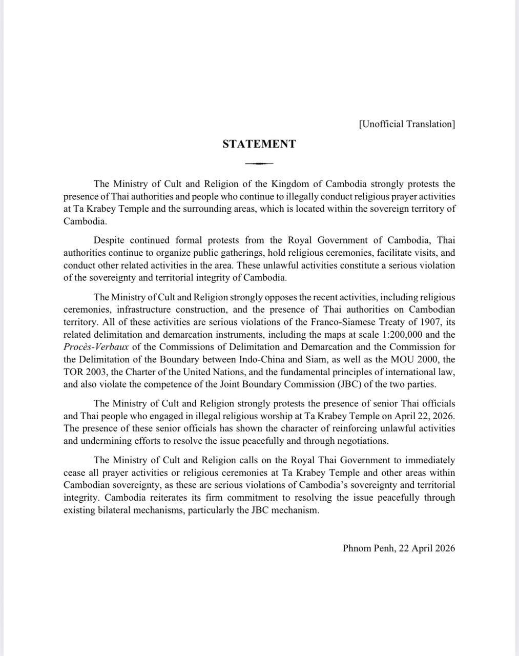 ក្រសួងធម្មការ និងសាសនា ធ្វើការតវ៉ាយ៉ាងដាច់អហង្ការ ចំពោះវត្តមានរបស់មន្ត្រីជាន់ខ្ពស់ថៃ និង ប្រជាជនថៃ ដែលធ្វើសកម្មភាពបួងសួងបែបជំនឿសាសនាខុសច្បាប់ នៅប្រាសាទតាក្របី នៅថ្ងៃទី២២ ខែមេសា ឆ្នាំ២០២៦ នេះ។ វត្តមានរបស់មន្ត្រីជាន់ខ្ពស់ទាំងនេះ បានបង្ហាញពីចរិតលក្ខណៈពង្រឹងសកម្មភាព ខុសច្បាប់ និងបំផ្លាញដល់កិច្ចខិតខំប្រឹងប្រែងដោះស្រាយបញ្ហាដោយសន្តិវិធីនិងតាមរយៈការចរចា។