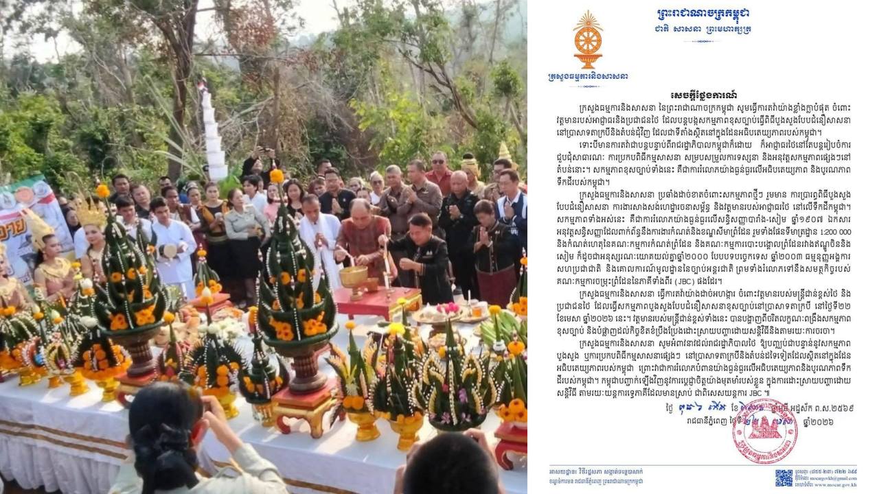 ក្រសួងធម្មការ និងសាសនា ប្រឆាំងដាច់ខាតចំពោះសកម្មភាពថ្មីៗ រួមមាន ការប្រារព្ធពិធីបួងសួង បែបជំនឿសាសនា ការងារសាងសង់ហេដ្ឋារចនាសម្ព័ន្ធ និងវត្តមានរបស់អាជ្ញាធរថៃ នៅលើទឹកដីកម្ពុជា។ សកម្មភាពទាំងអស់នេះ គឺជាការរំលោភយ៉ាងធ្ងន់ធ្ងរលើសន្ធិសញ្ញាបារាំង-សៀម ឆ្នាំ១៩០៧ ឯកសារ អនុវត្តសន្ធិសញ្ញាដែលពាក់ព័ន្ធនឹងការងារកំណត់ និងខណ្ឌសីមាព្រំដែន រួមទាំងផែនទីមាត្រដ្ឋាន 1:200 000 និងកំណត់ហេតុនៃគណៈកម្មការកំណត់ព្រំដែន និងគណៈកម្មការបោះបង្គោលព្រំដែនរវាងឥណ្ឌូចិន និងសៀម ក៏ដូចជាអនុស្សរណៈយោគយល់គ្នាឆ្នាំ២០០០ បែបបទបច្ចេកទេស ឆ្នាំ២០០៣ ធម្មនុញ្ញអង្គការសហប្រជាជាតិ និងគោលការណ៍មូលដ្ឋាននៃច្បាប់អន្តរជាតិ ព្រមទាំងរំលោភទៅនឹងសមត្ថកិច្ចរបស់ គណៈកម្មការចម្រុះព្រំដែននៃភាគីទាំងពីរ (JBC) ផងដែរ។
